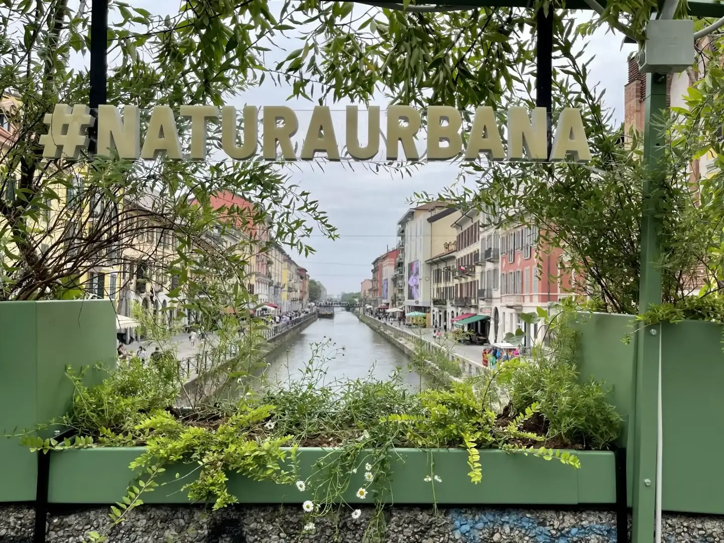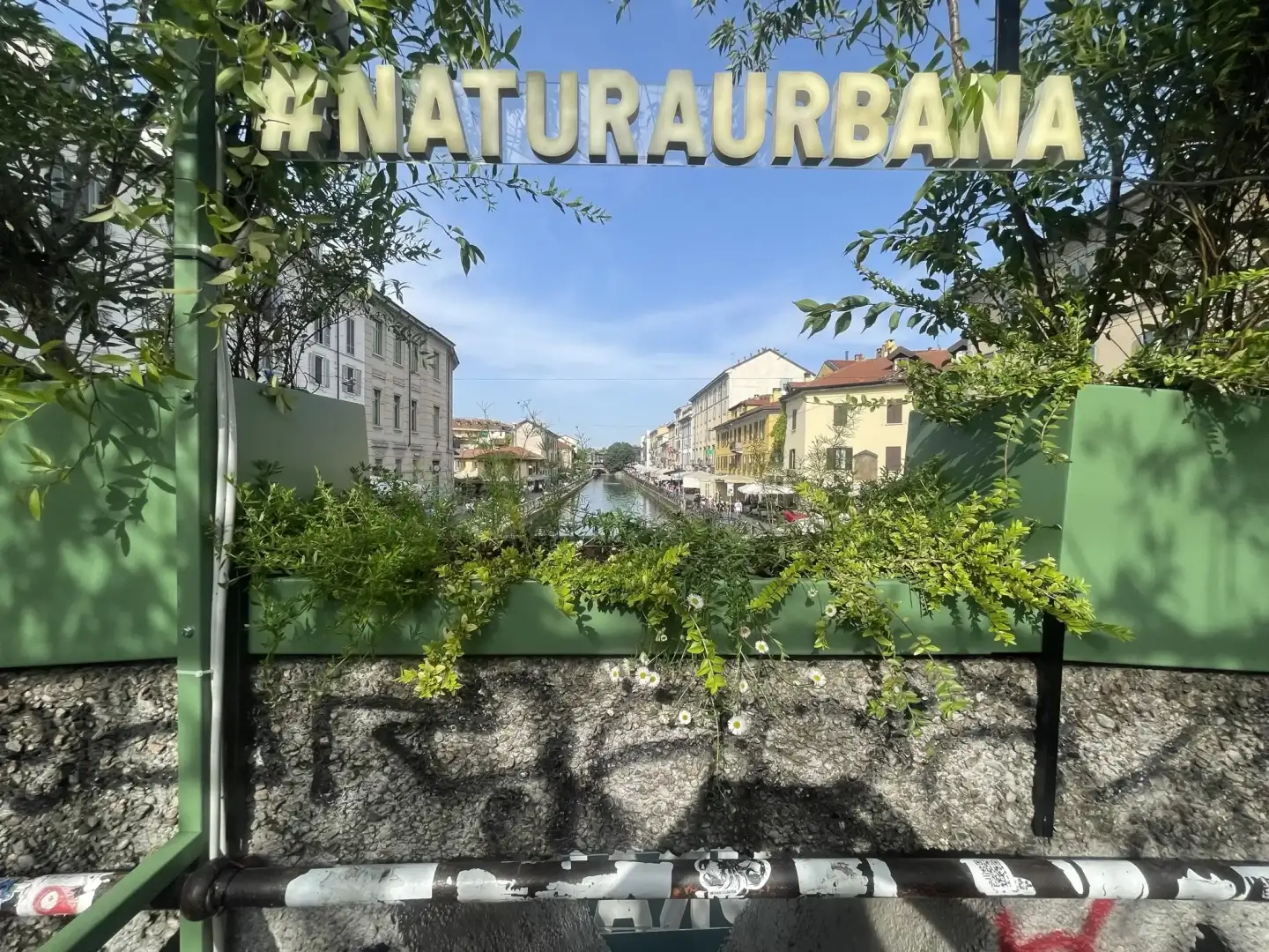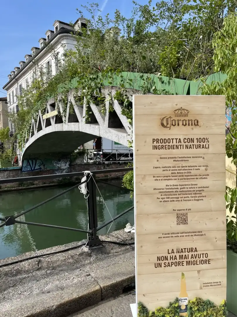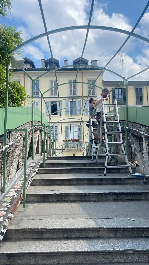 The initiative, along Milan's Naviglio Grande, took place on the Alda Merini Bridge, transformed into an experiential green tunnel, vitalized by the direct participation of citizens, alongside two murals executed with an innovative paint capable of absorbing CO2.