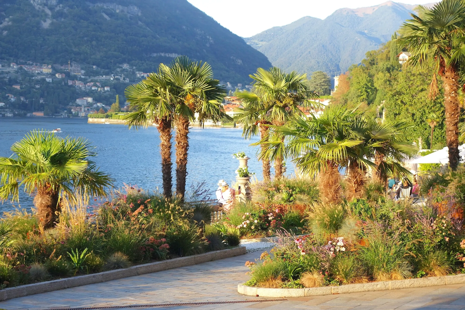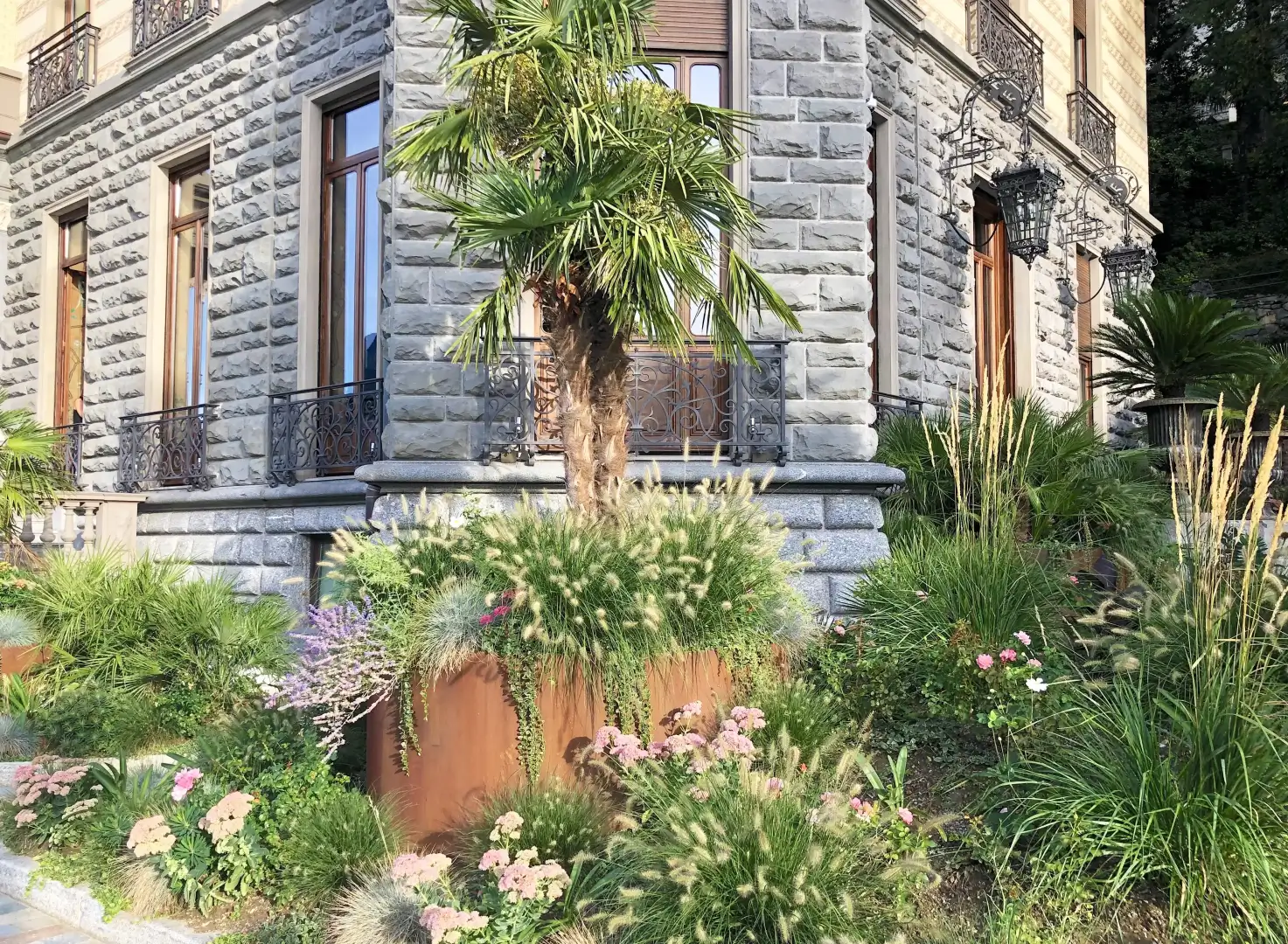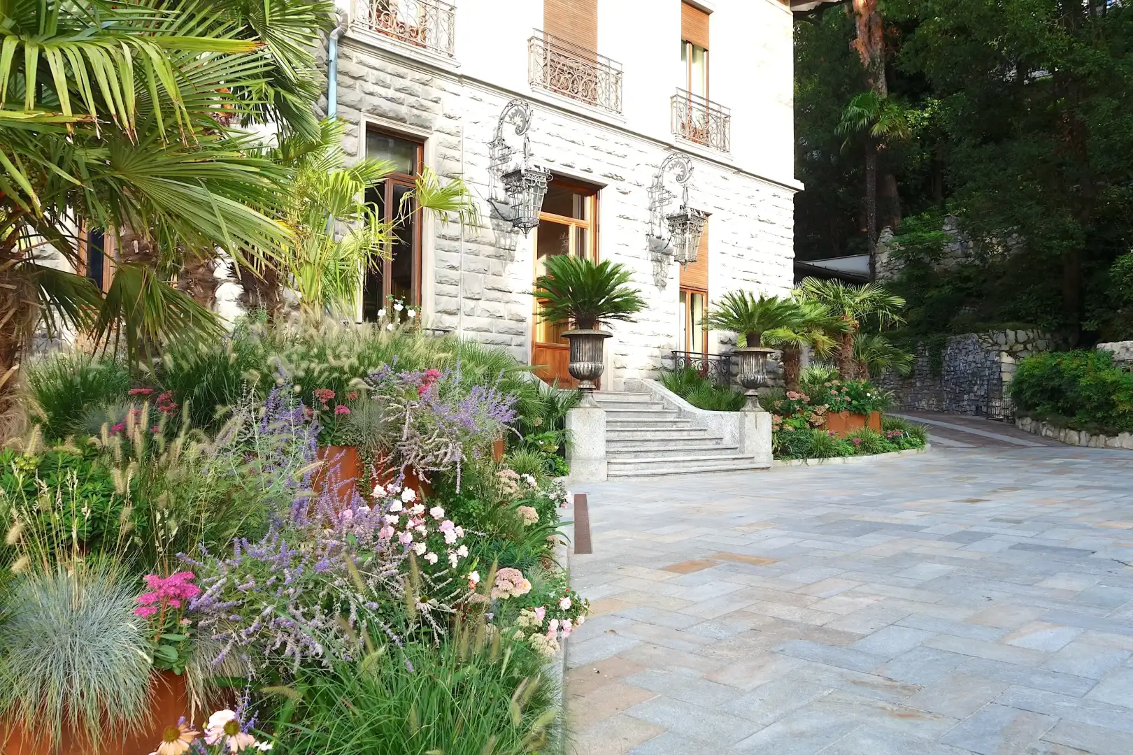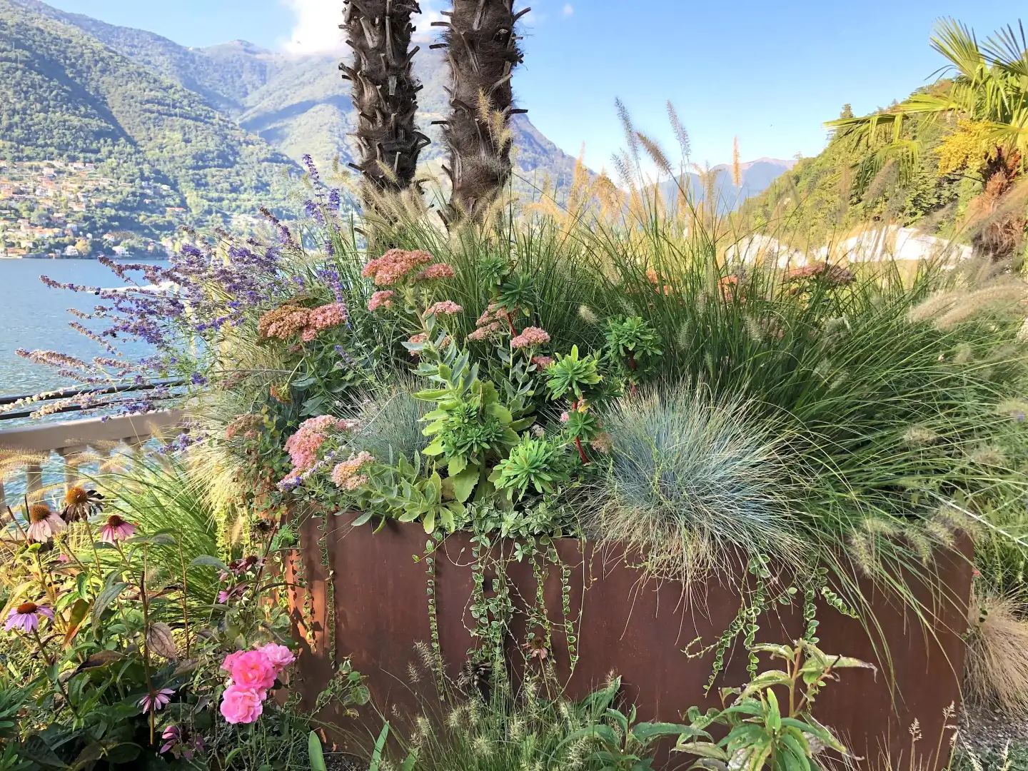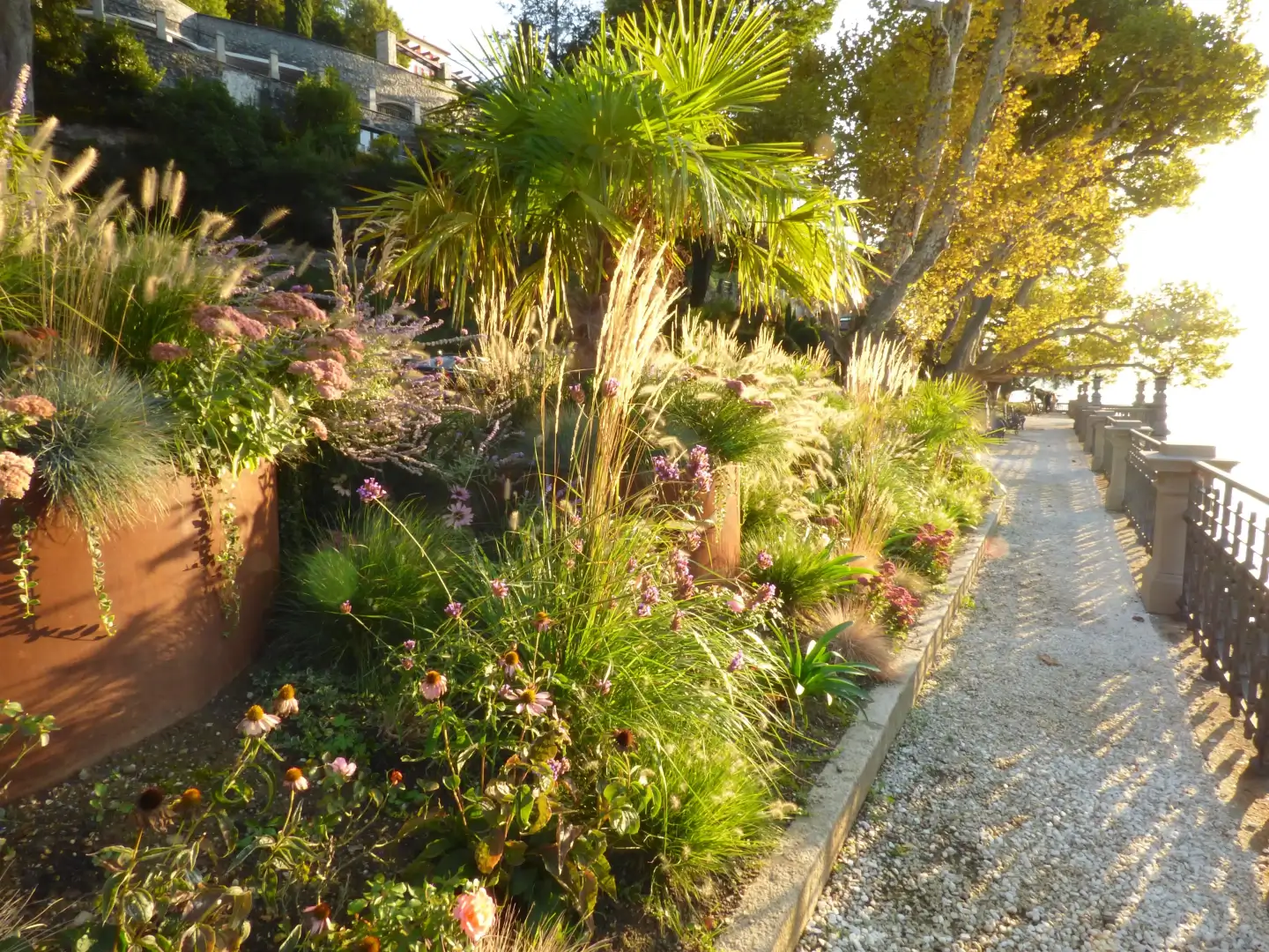 Un prezioso contributo al progetto di riqualificazione del giardino annesso all’esclusivo Mandarin Oriental Resort sul lago di Como, assegnatoallo studio Patrizia Pozzi Landscape Architecture, che ha scelto di avvalersi della nostra consulenza per la scelte botaniche e per ilposizionamento delle piante nelle aree di intervento lungolago, per dar vita ad un quadro unico, dalle caratteristiche inconfondibili.La richiesta di realizzare una scenografia vegetale adeguata ad un luogo affacciato su uno dei punti più belli dellapreziosa cornice del lago lariano, si è tradotta in proposte botaniche e soluzioni compositive capaci di esaltare ilsito, ed interpretarne le luci ed i colori mutevoli.Le scelte vegetali si sono incentrate su un’alternanza di fioriture dai toni raffinati e ricercati, e di spighe dalleseducenti trasparenze: dalle corolle color rosa antico delle tante erbacee perenni ai panicoli bianco perla delleortensie, dalle infiorescenze leggere e dorate delle graminacee, fluttuanti al ritmo delle brezze, stagliate nel cielocangiante.Il risultato è un quadro in continuo movimento, perennemente diverso con il variare delle stagioni, sofisticato emorbido, avvolgente ed accogliente, sensuale ed accattivante.Il ritmo è dettato dal tronco svettante delle tante palme che si rincorrono in tutto il giardino, che generanoun’atmosfera di giungla, esuberante ma addomesticata, in un dialogo ininterrotto con l’architettura circostante.Un luogo magico in cui perdersi e lasciarsi viziare.
