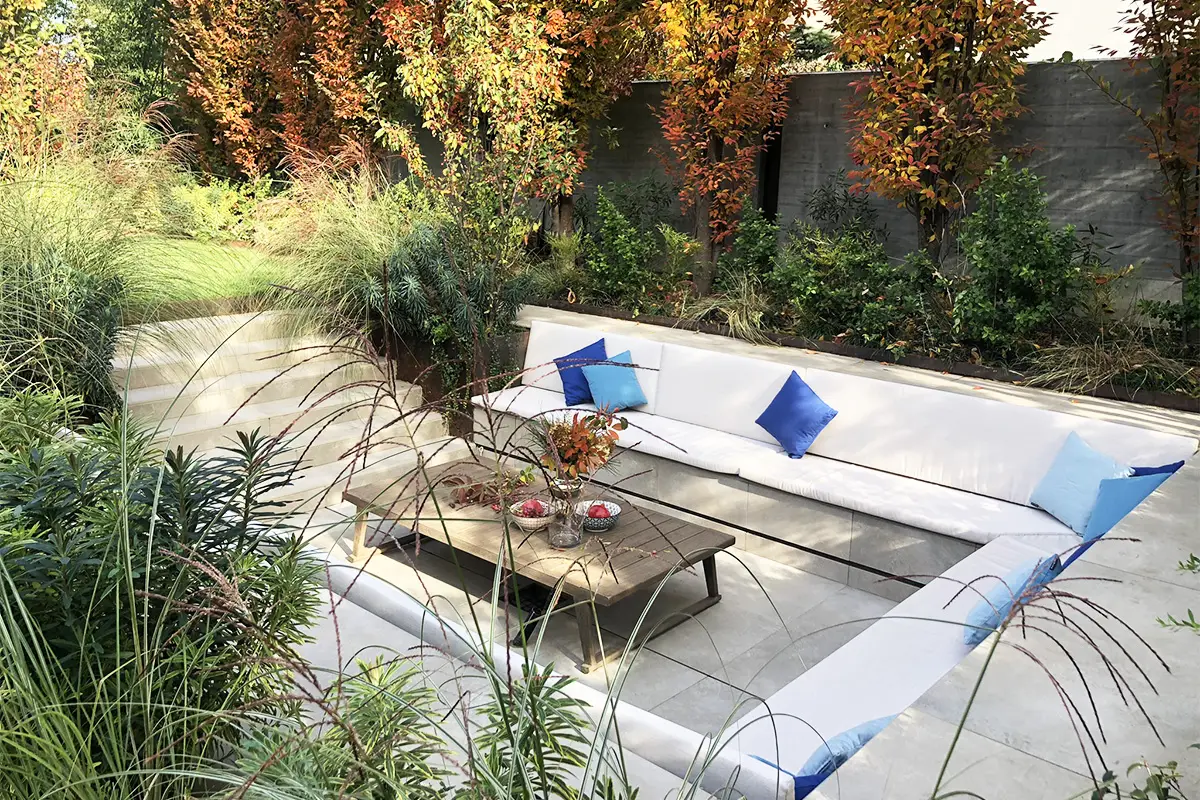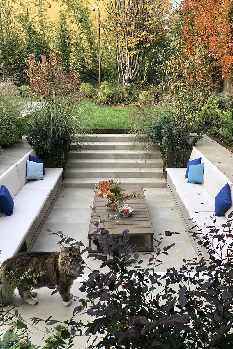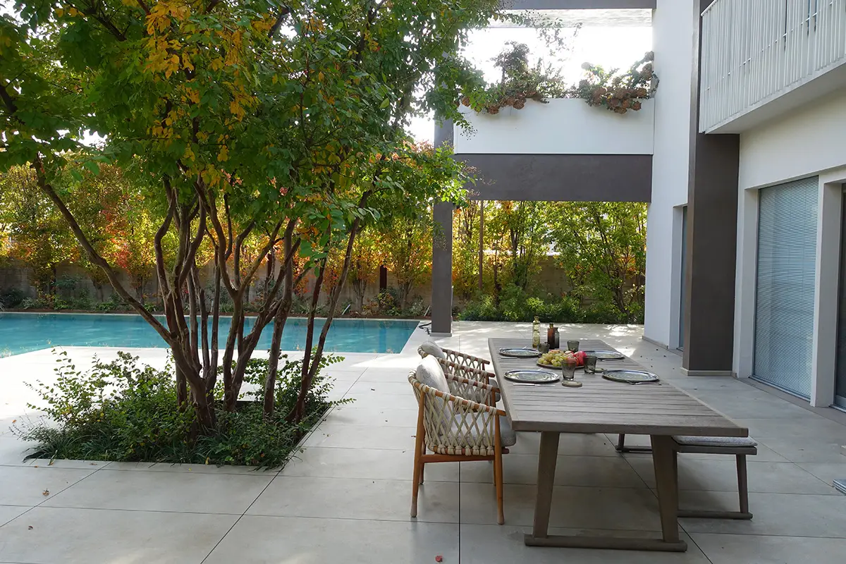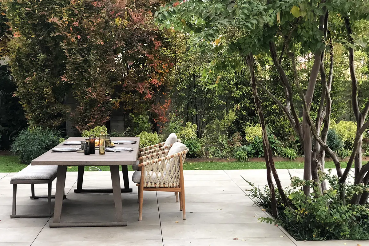 Un invitante tavolo chiama a raccolta la famiglia e gli amici, ombreggiato dalle fronde di una Lagestroemia dalla grafica silhouette.