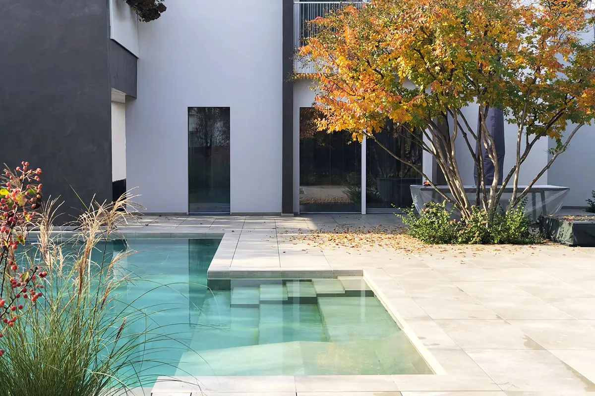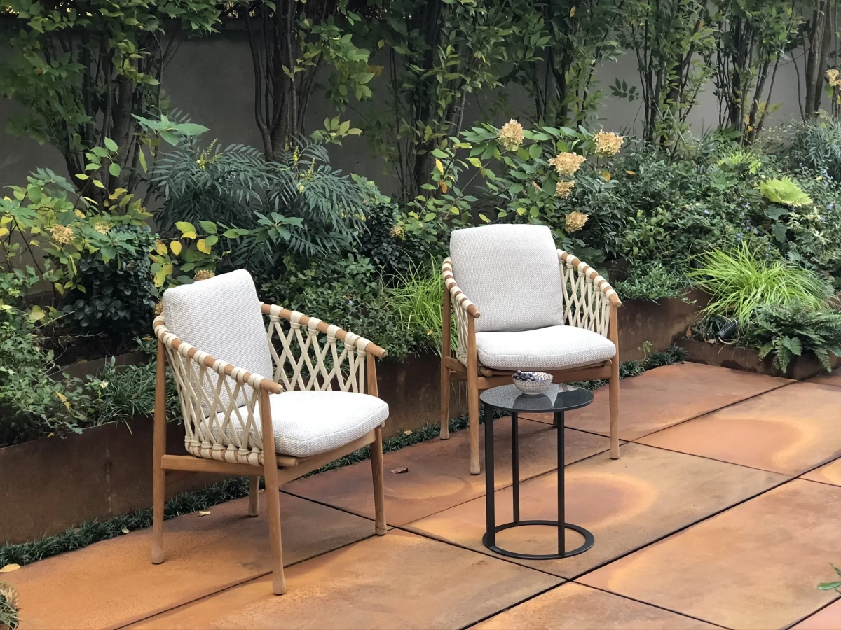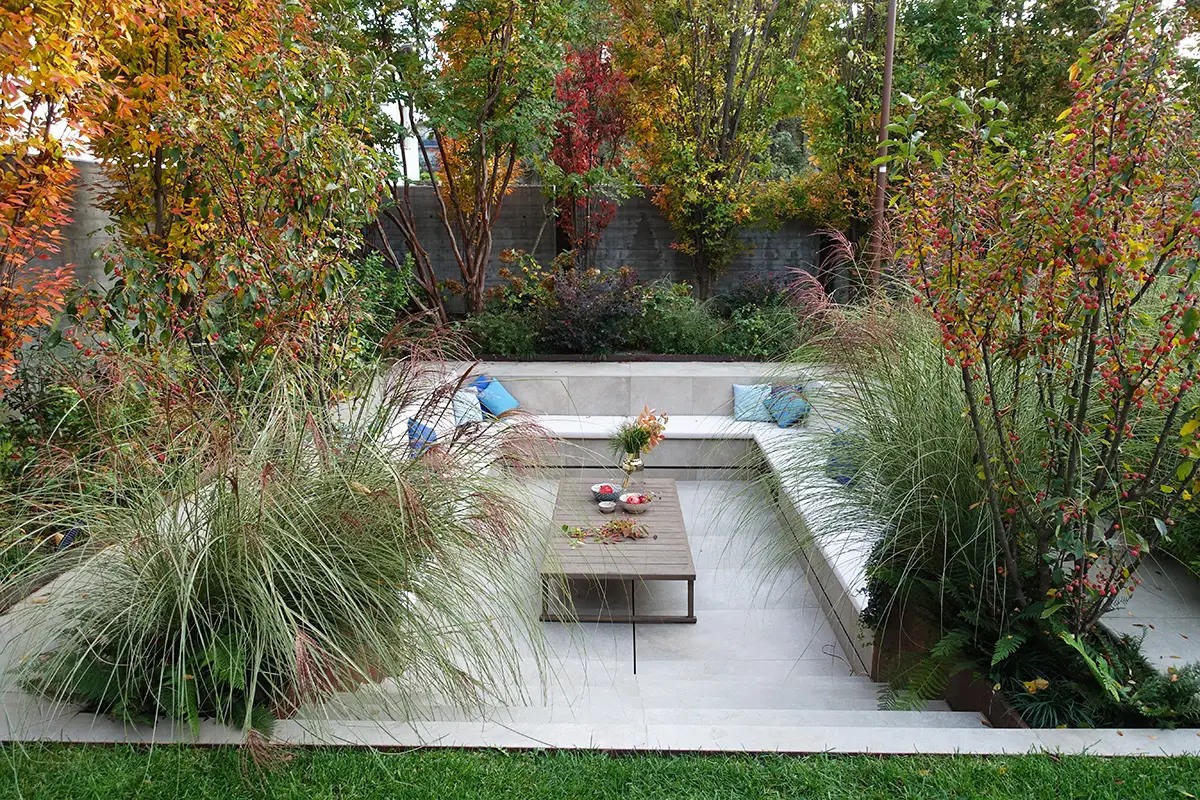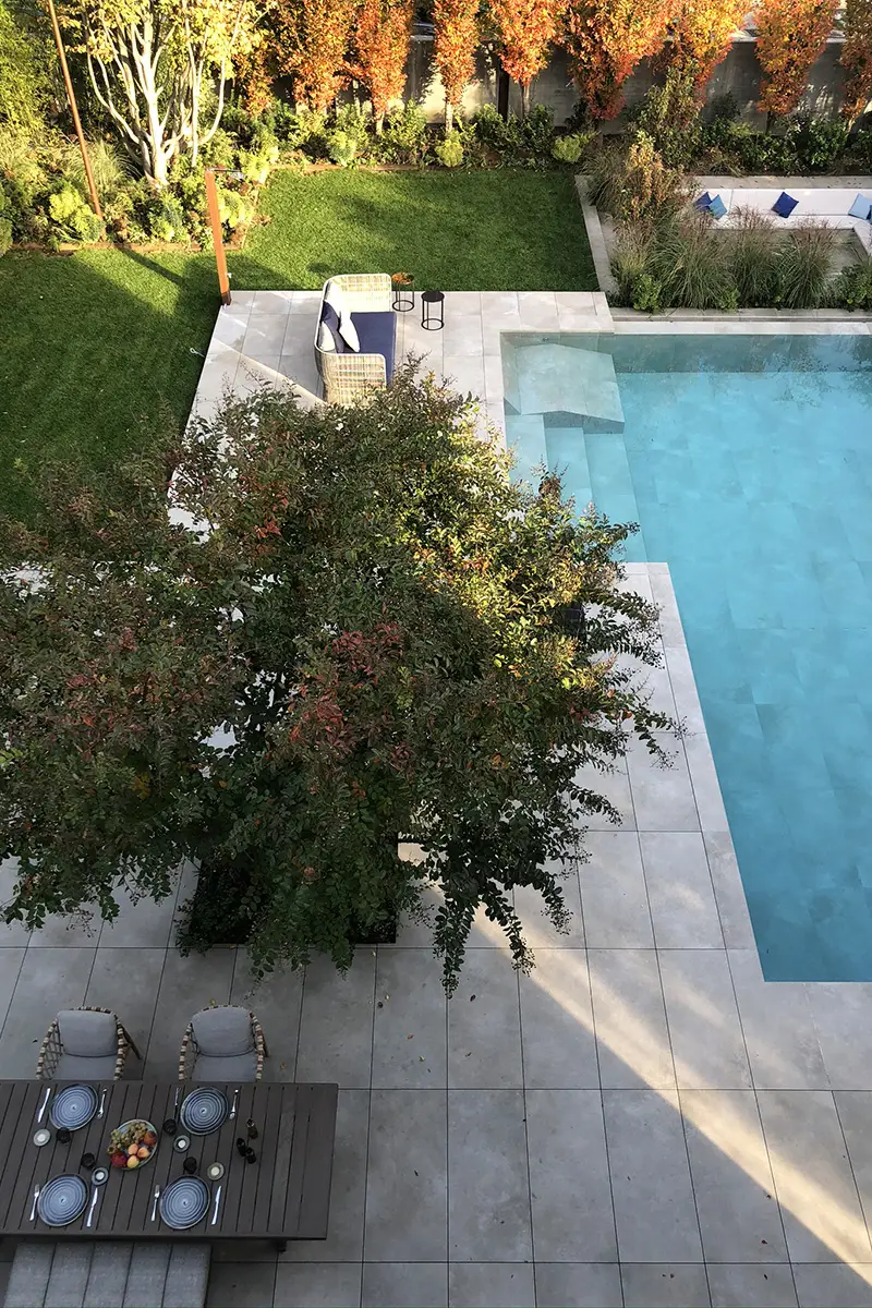 Un invitante tavolo chiama a raccolta la famiglia e gli amici, ombreggiato dalle fronde di una Lagestroemia dalla grafica silhouette.