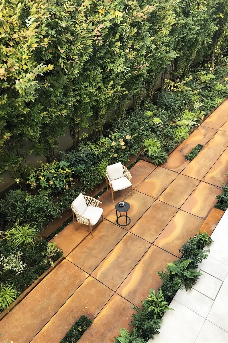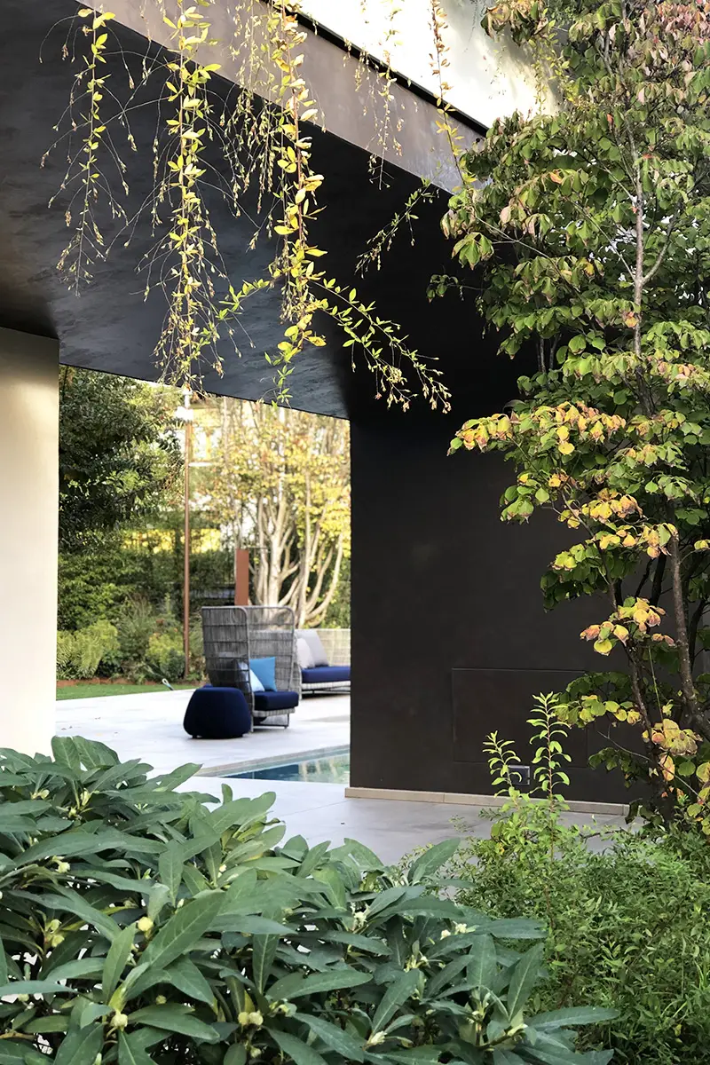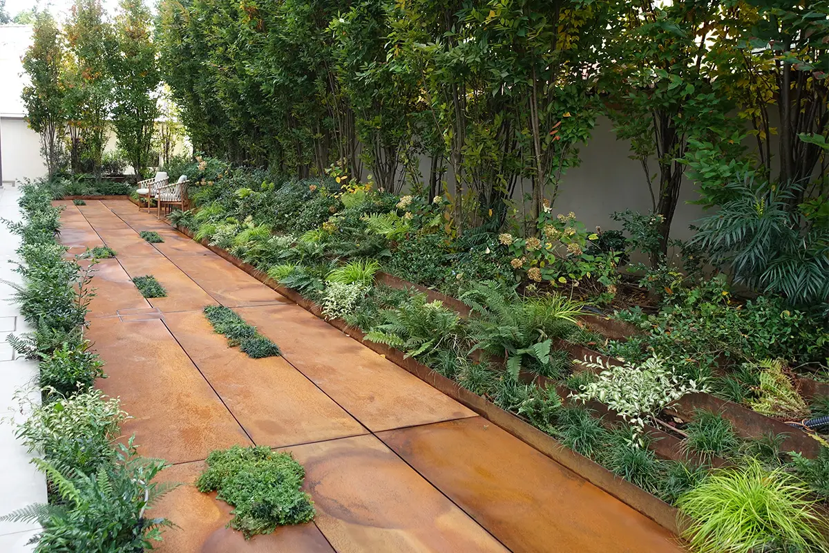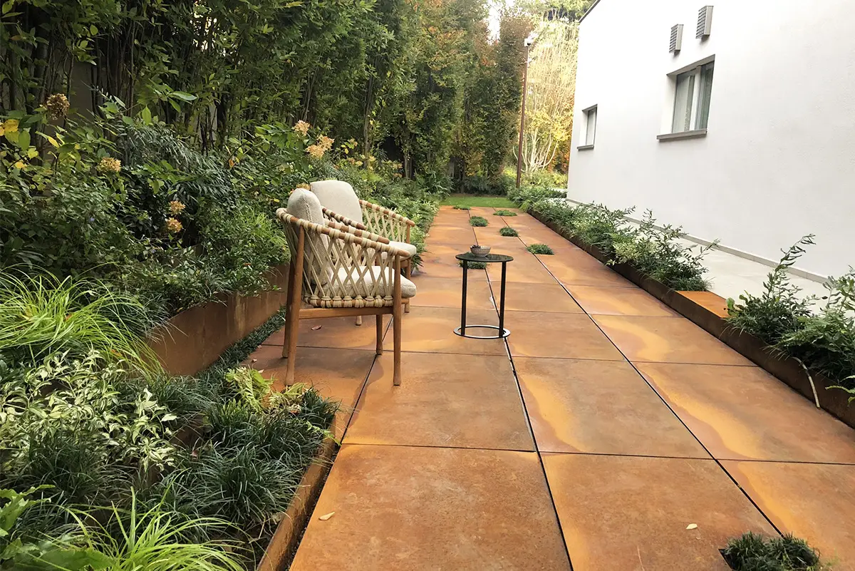 Il corridoio a nord della casa è stato risolto attraverso una scenografica pavimentazione in ampie lastre di corten, materiale chiave all’interno del giardino. Esso infatti compone le tante aiuole rialzate e geometriche che accolgono varie tipologie di piante, in un felice connubio tra rigore ed esuberanza.