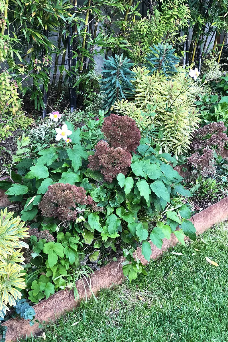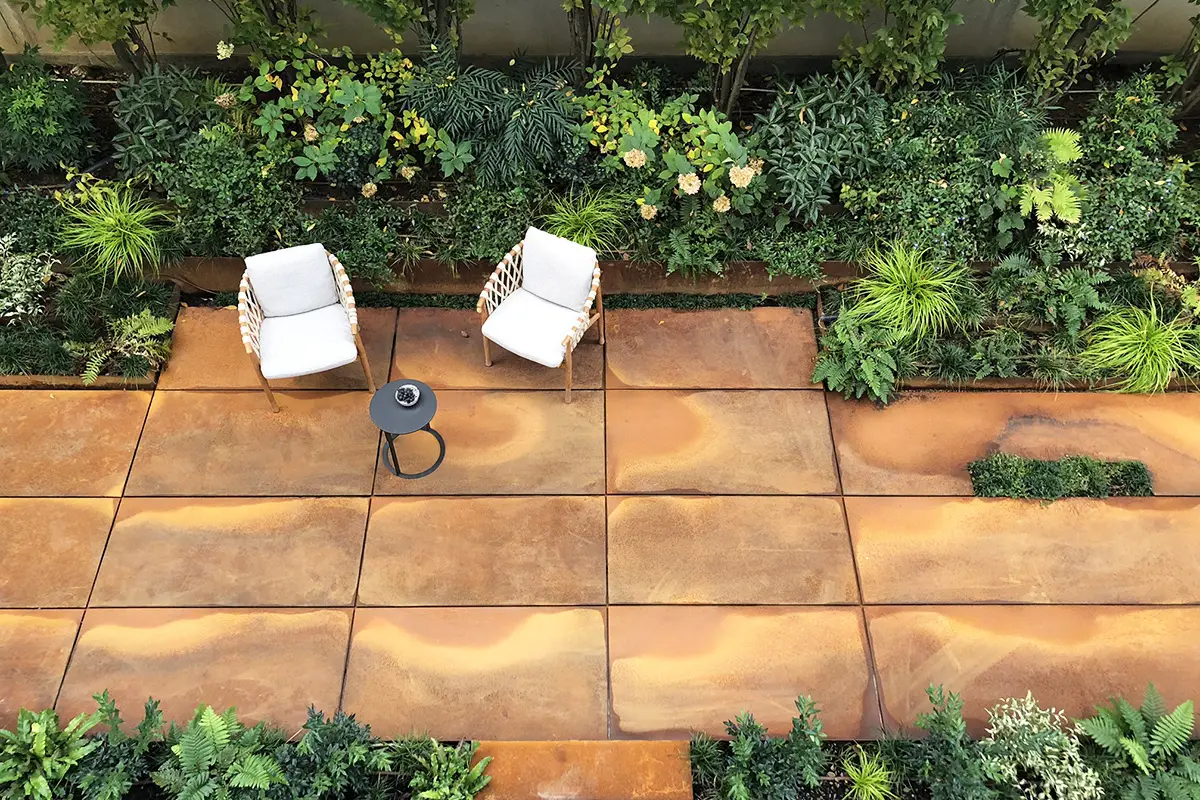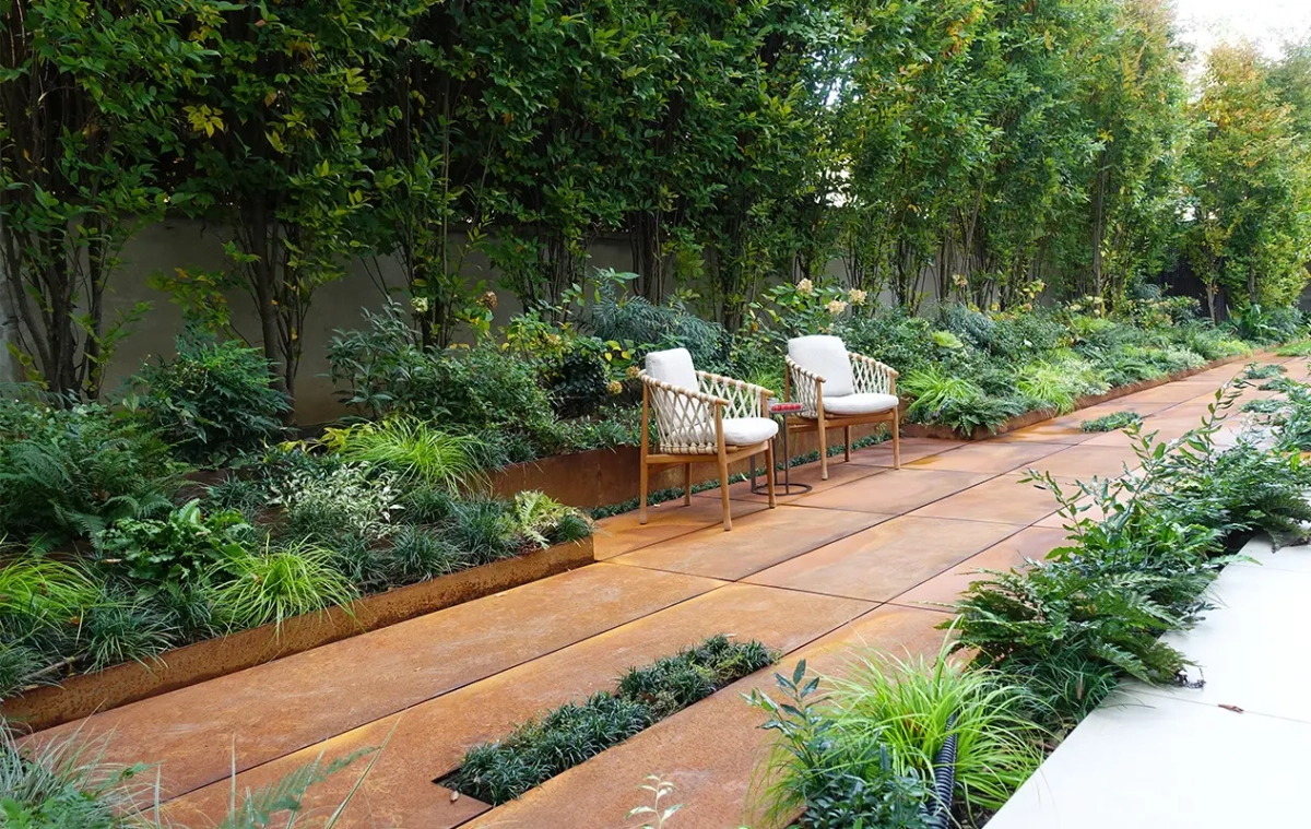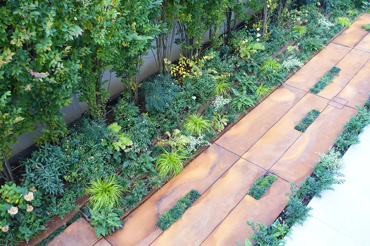 Il corridoio a nord della casa è stato risolto attraverso una scenografica pavimentazione in ampie lastre di corten, materiale chiave all’interno del giardino. Esso infatti compone le tante aiuole rialzate e geometriche che accolgono varie tipologie di piante, in un felice connubio tra rigore ed esuberanza.