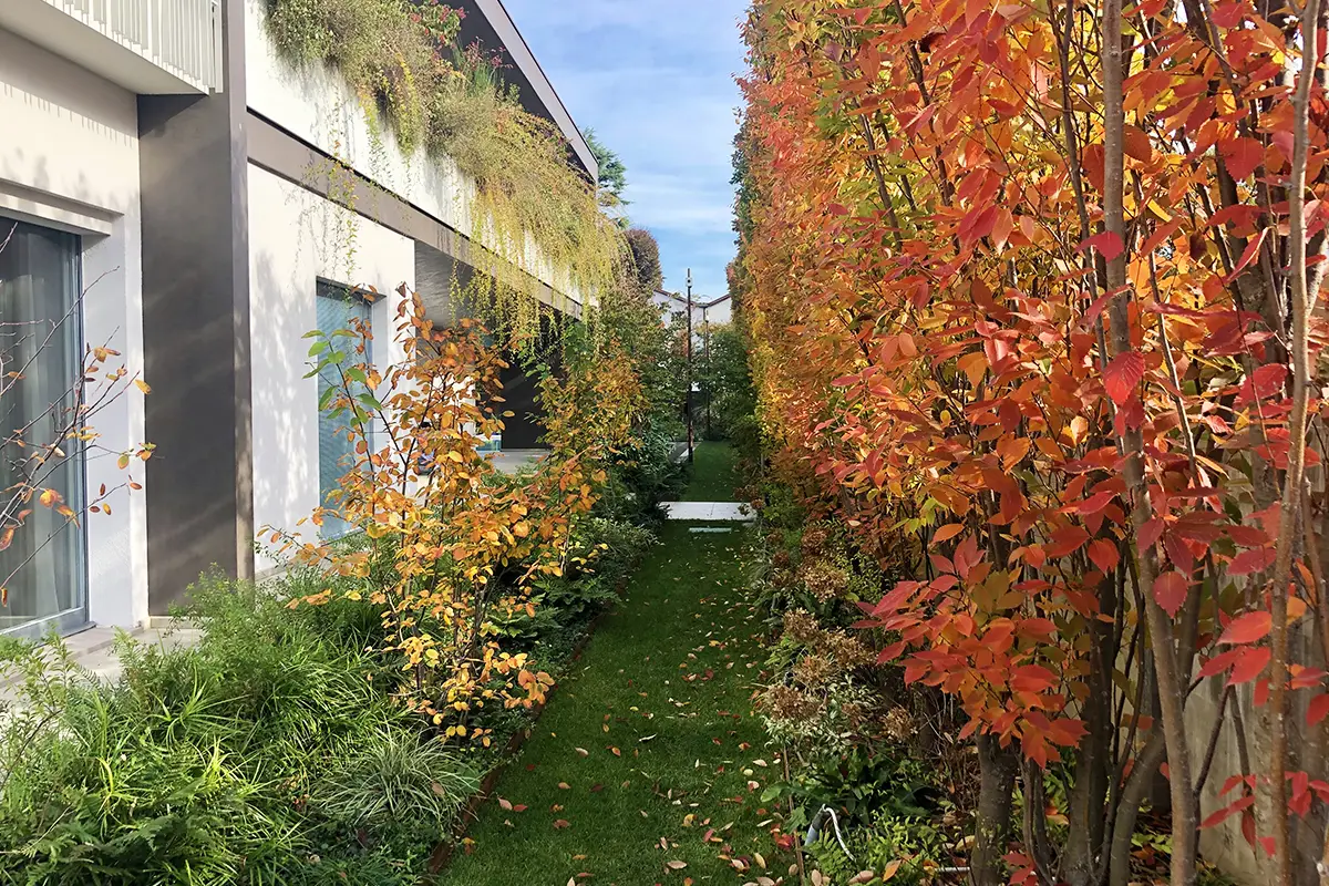 Due corridoi verdi fiancheggiano la casa sui lati, delimitati da un’ininterrotta sequenza di alberature che generano privacy ed arricchiti da innumerevoli piante, che attirano lo sguardo in momenti diversi dell’anno.