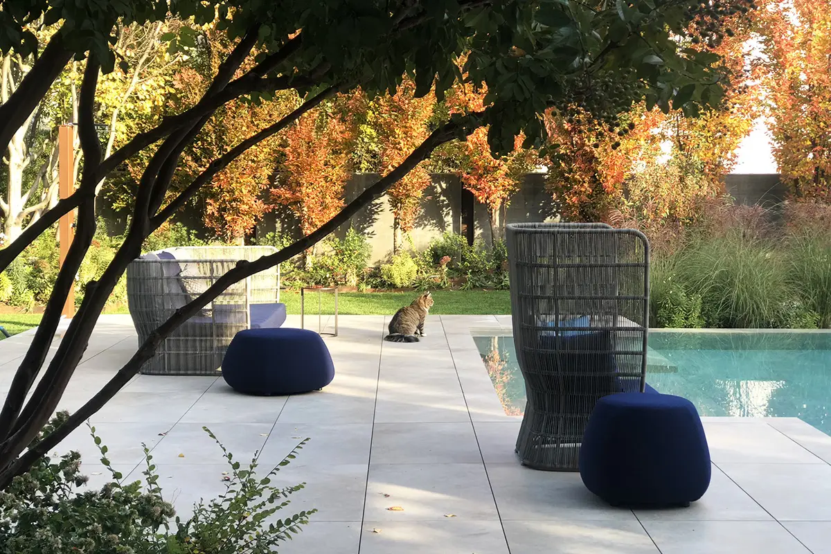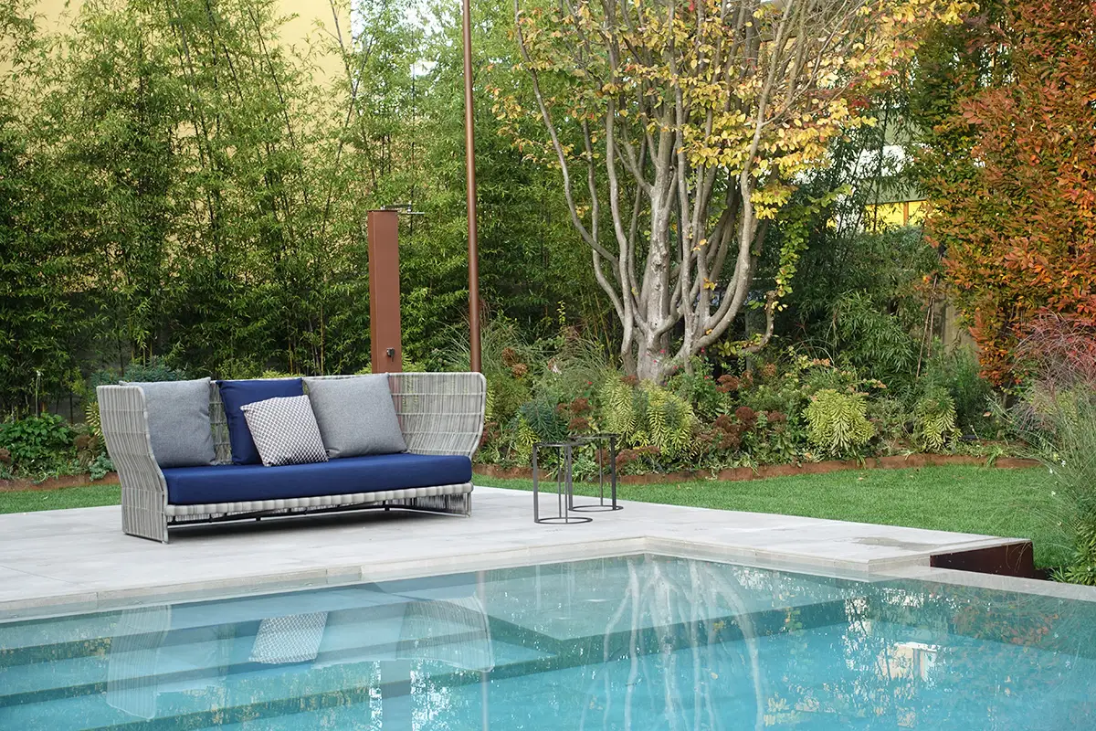 Subito oltre, l’elegante piscina dialoga con l’azzurro del cielo, rivestita con il medesimo materiale della pavimentazione, per dissolvere i confini con la zona living, dove accoglienti sedute invitano al relax.