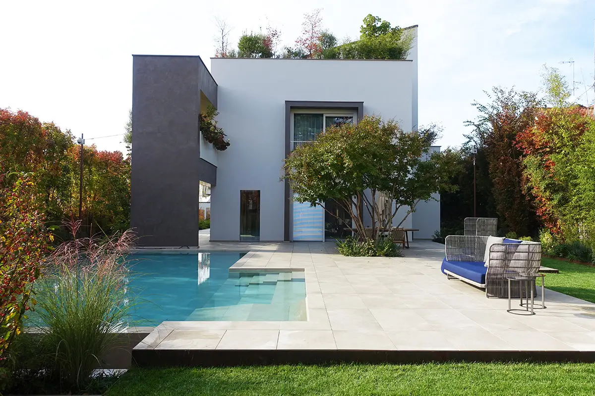 Una villa monofamiliare dalle linee contemporanee, costruita rigorosamente nel rispetto delle tecnologie verdi ed ecosostenibili più all’avanguardia, è completamente circondata da un grande giardino, che la integra ed accoglie armoniosamente.