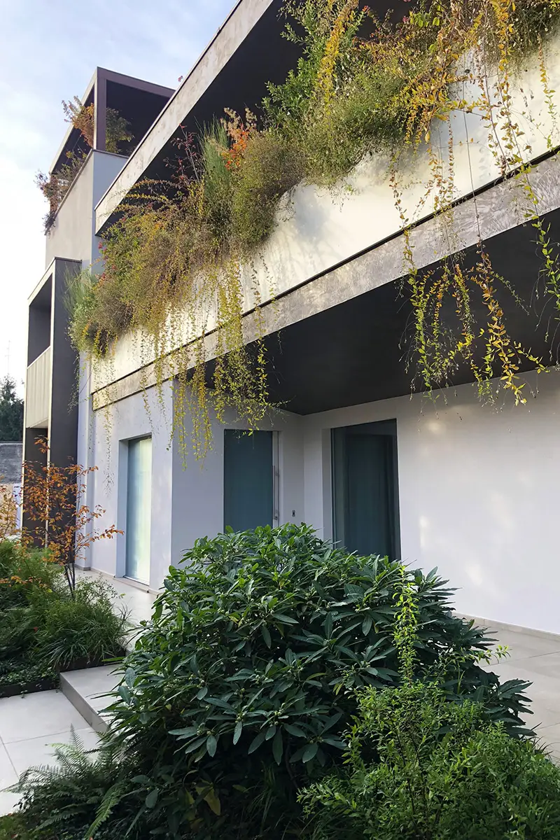 I balconi che si affacciano sul corridoio di ingresso accentuano la sensazione di entrare in un’oasi verde, attraverso la vegetazione lussureggiante che si sviluppa fin oltre le balaustre, in una cascata di piante e fiori.