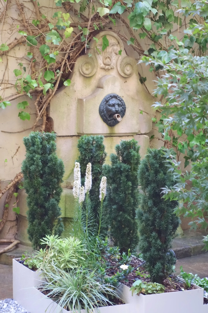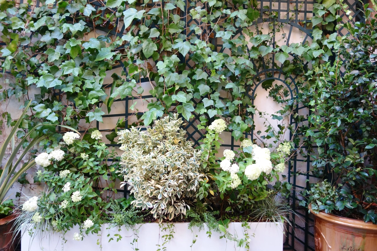 Un piccolo giardino, circondato a ferro di cavallo da una ricercata abitazione privata nel cuore di Parigi, costituisce un prezioso affaccio dalle finestre del piano superiore e un’oasi segreta in cui rifugiarsi. Le mura perimetrali creano un contesto ombroso, rischiarato da raffinate fioriture e variegature del fogliame sui toni del bianco e verde, declinato in molteplici sfumature, e da contenitori grigio luce che emergono dalla ghiaia chiara. Un giardino, pur nella sua sofisticatezza, a bassa manutenzione; una reinterpretazione in chiave moderna del giardino formale alla francese.