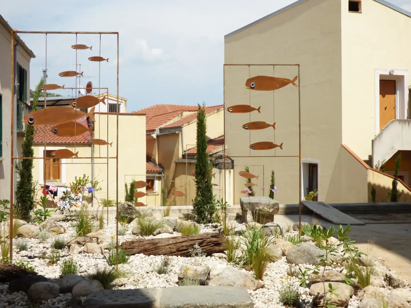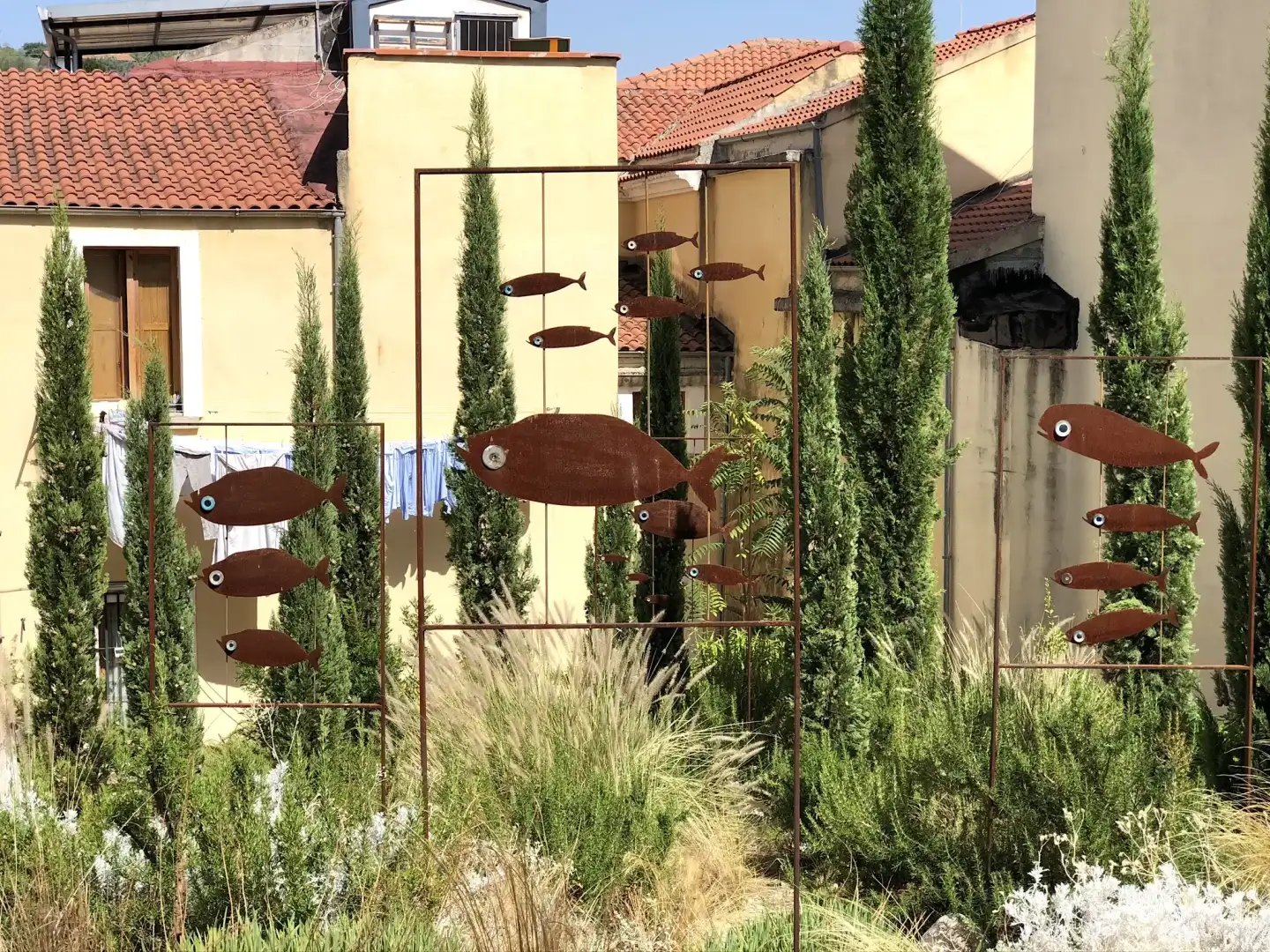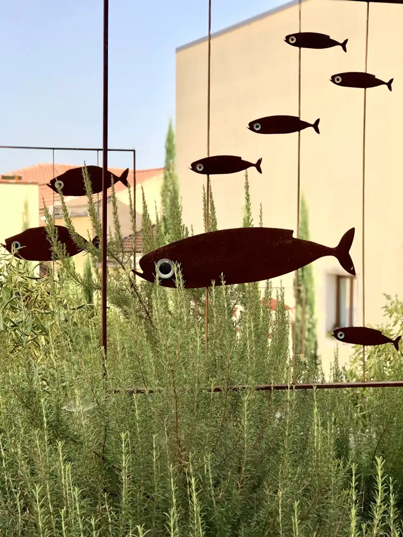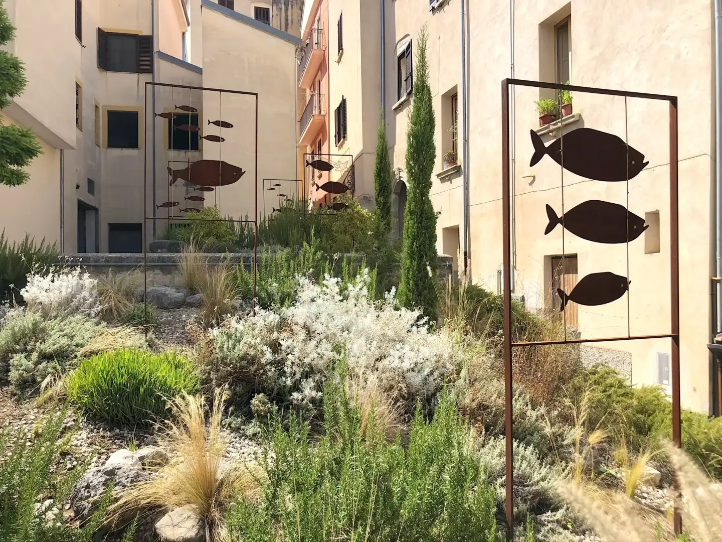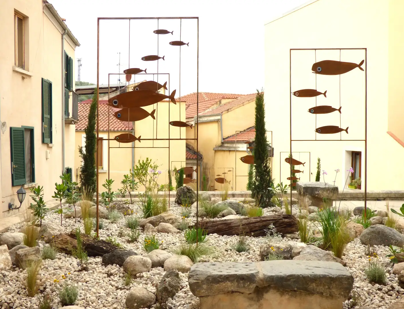 L’intervento è teso alla rievocazione del mare, geograficamente situato a breve distanza, attraverso la creazione di un fondale terrestre, composto da piante mediterranee che ricordano nelle forme e colori la vegetazione subacquea, in cui fluttuano pesci dall’insolito occhio vivido ed attraente Lecornici metalliche rettangolari, che li inquadrano ed impreziosiscono, ripropongono le geometrie delle tante finestre che si affacciano su largo Marcangioni, con cui si crea una connessione visiva.