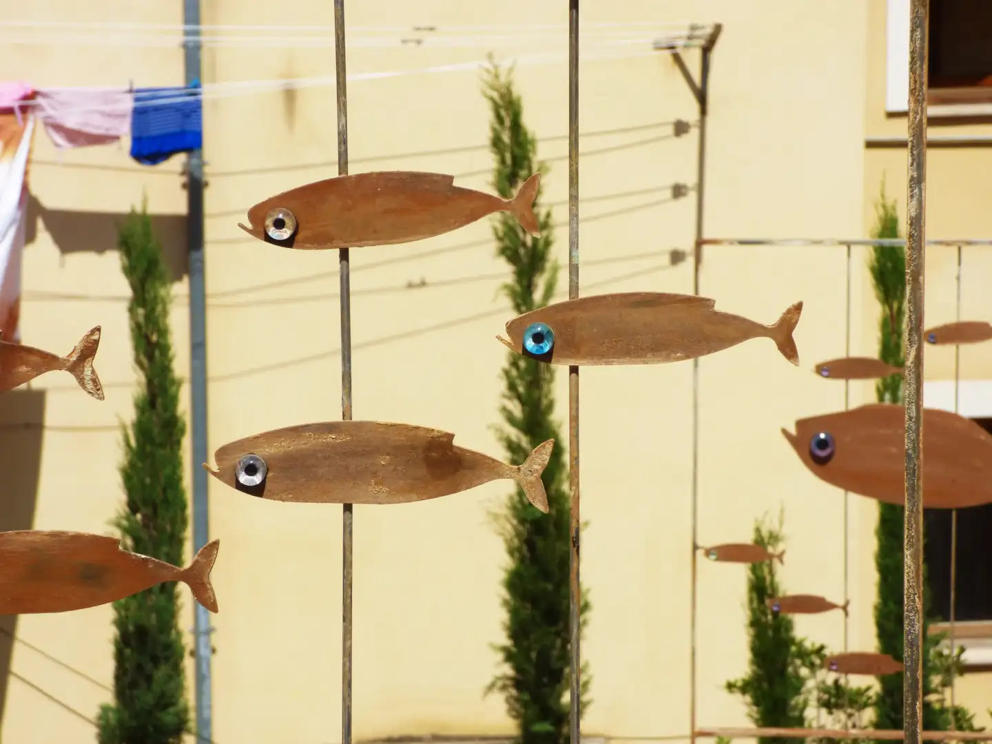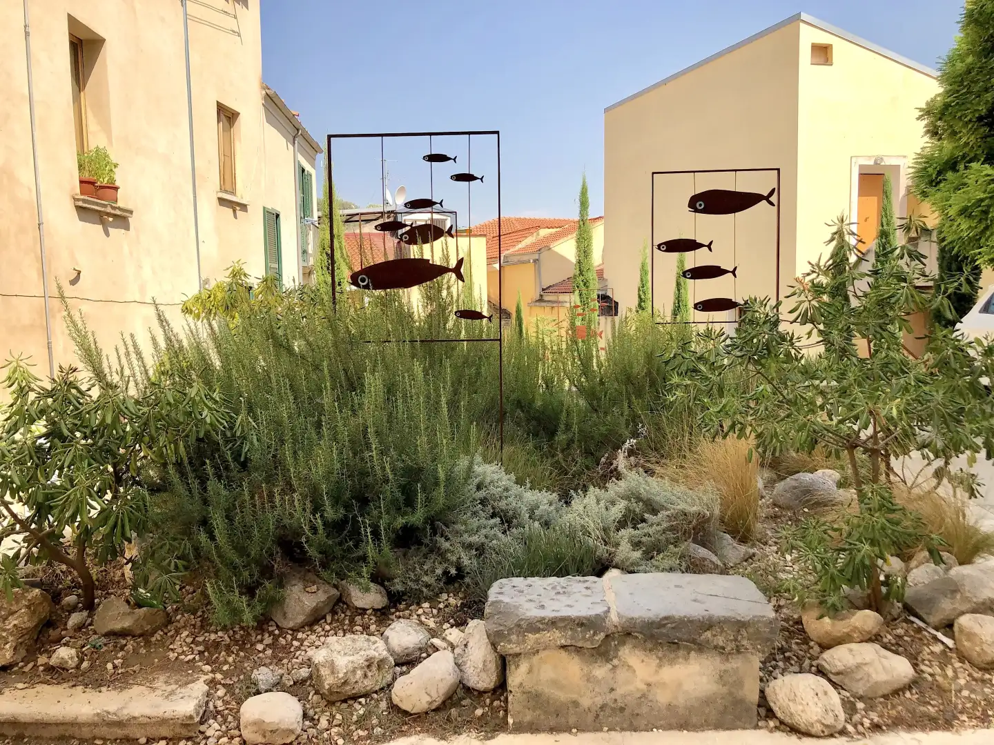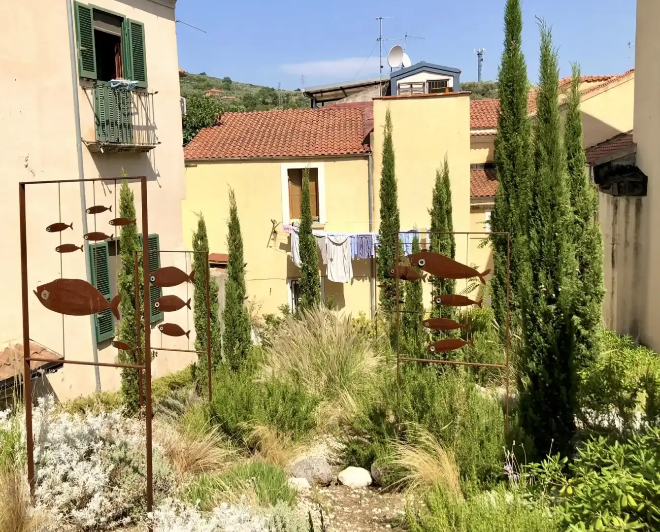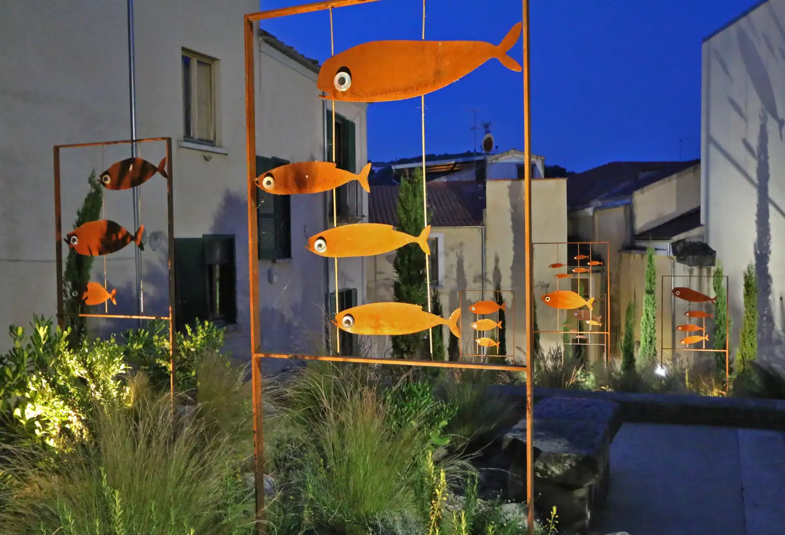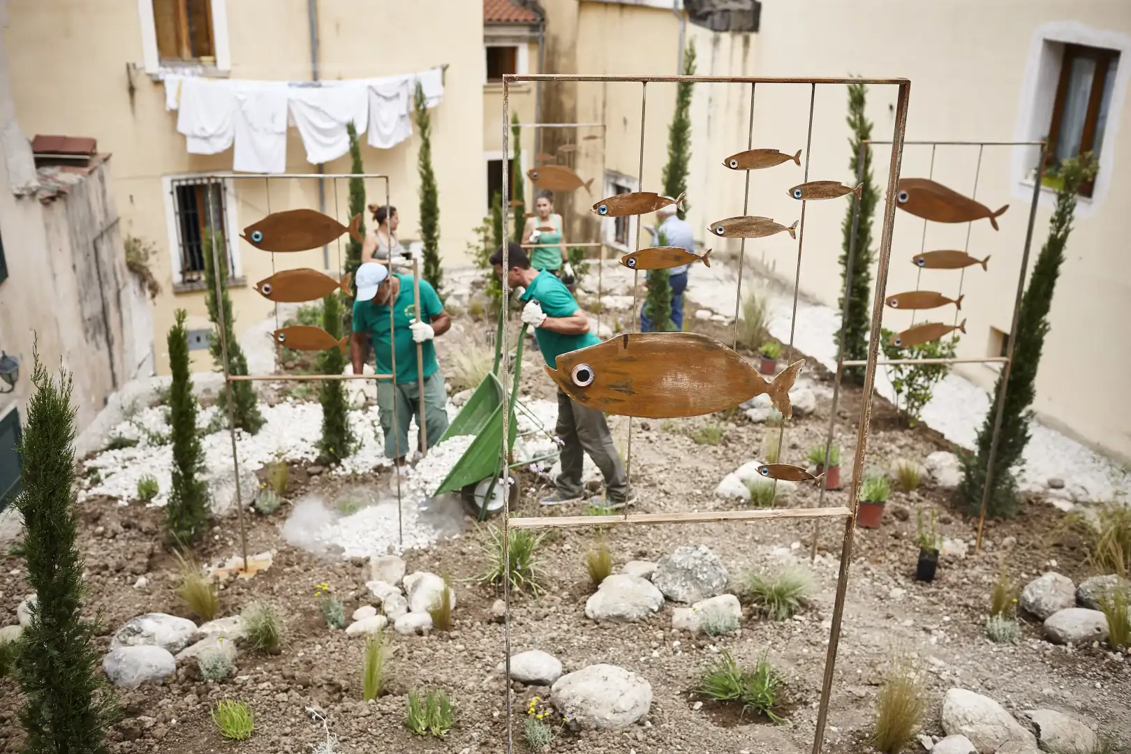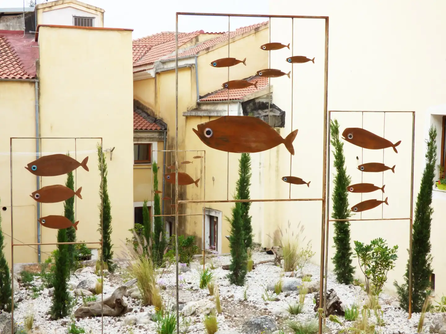 L’intervento è teso alla rievocazione del mare, geograficamente situato a breve distanza, attraverso la creazione di un fondale terrestre, composto da piante mediterranee che ricordano nelle forme e colori la vegetazione subacquea, in cui fluttuano pesci dall’insolito occhio vivido ed attraente Lecornici metalliche rettangolari, che li inquadrano ed impreziosiscono, ripropongono le geometrie delle tante finestre che si affacciano su largo Marcangioni, con cui si crea una connessione visiva.