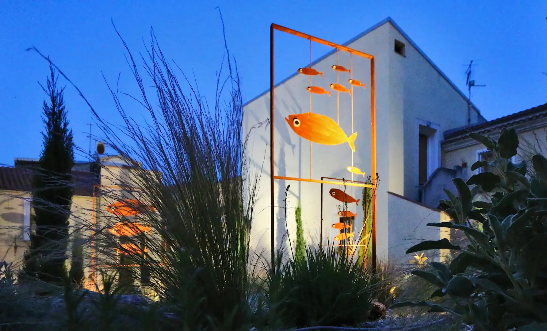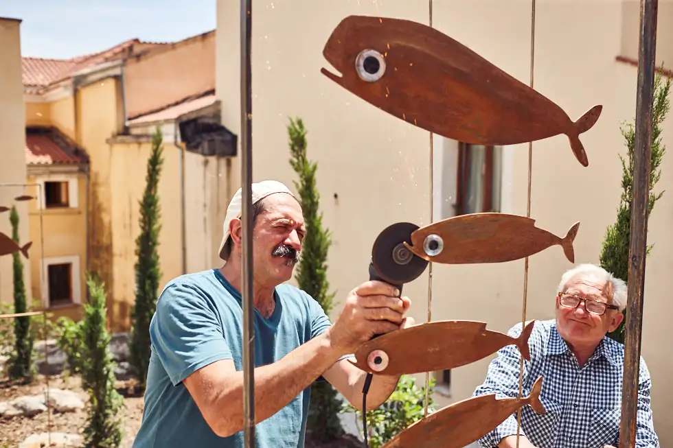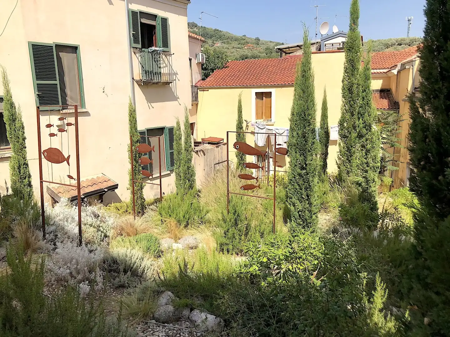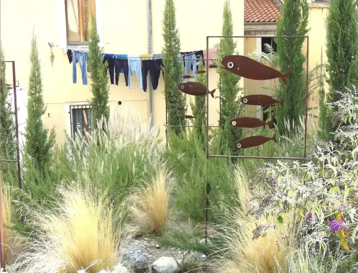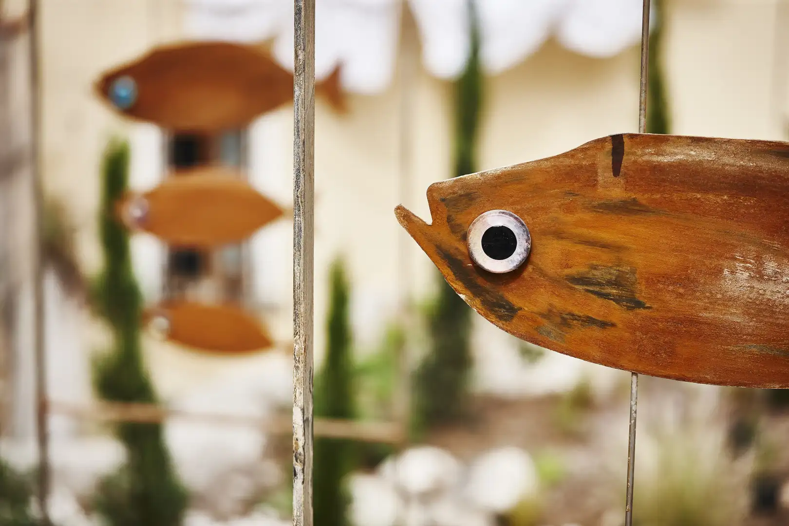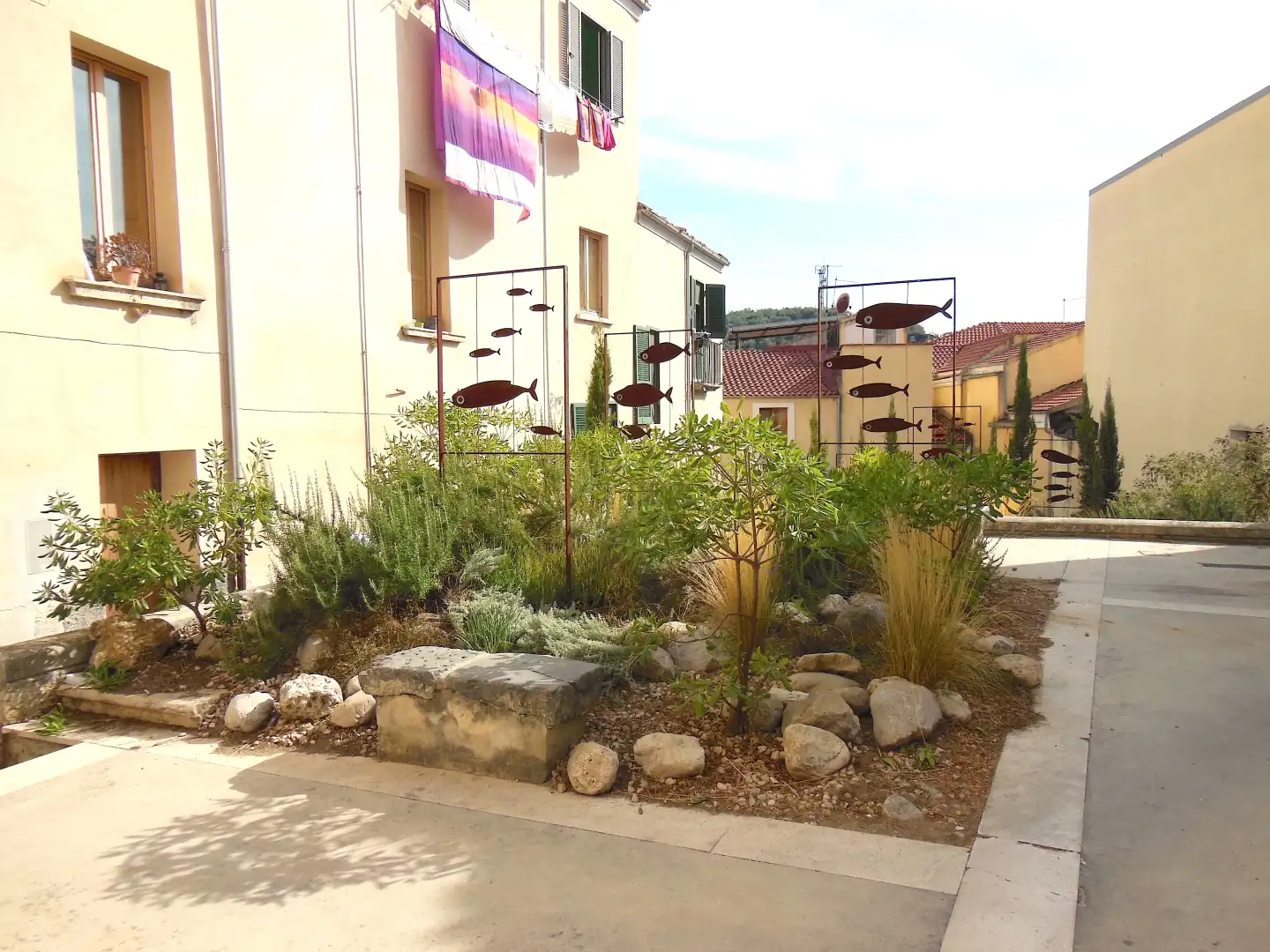 L’intervento è teso alla rievocazione del mare, geograficamente situato a breve distanza, attraverso la creazione di un fondale terrestre, composto da piante mediterranee che ricordano nelle forme e colori la vegetazione subacquea, in cui fluttuano pesci dall’insolito occhio vivido ed attraente Lecornici metalliche rettangolari, che li inquadrano ed impreziosiscono, ripropongono le geometrie delle tante finestre che si affacciano su largo Marcangioni, con cui si crea una connessione visiva.