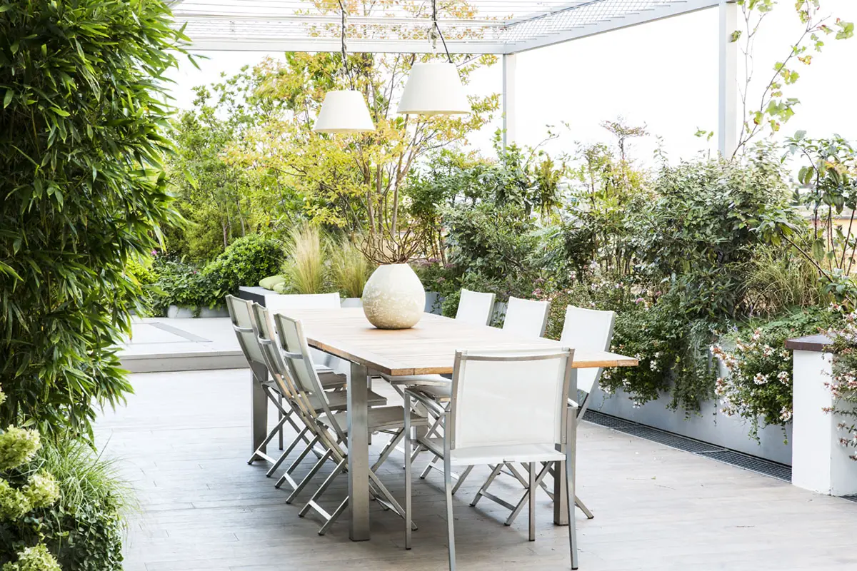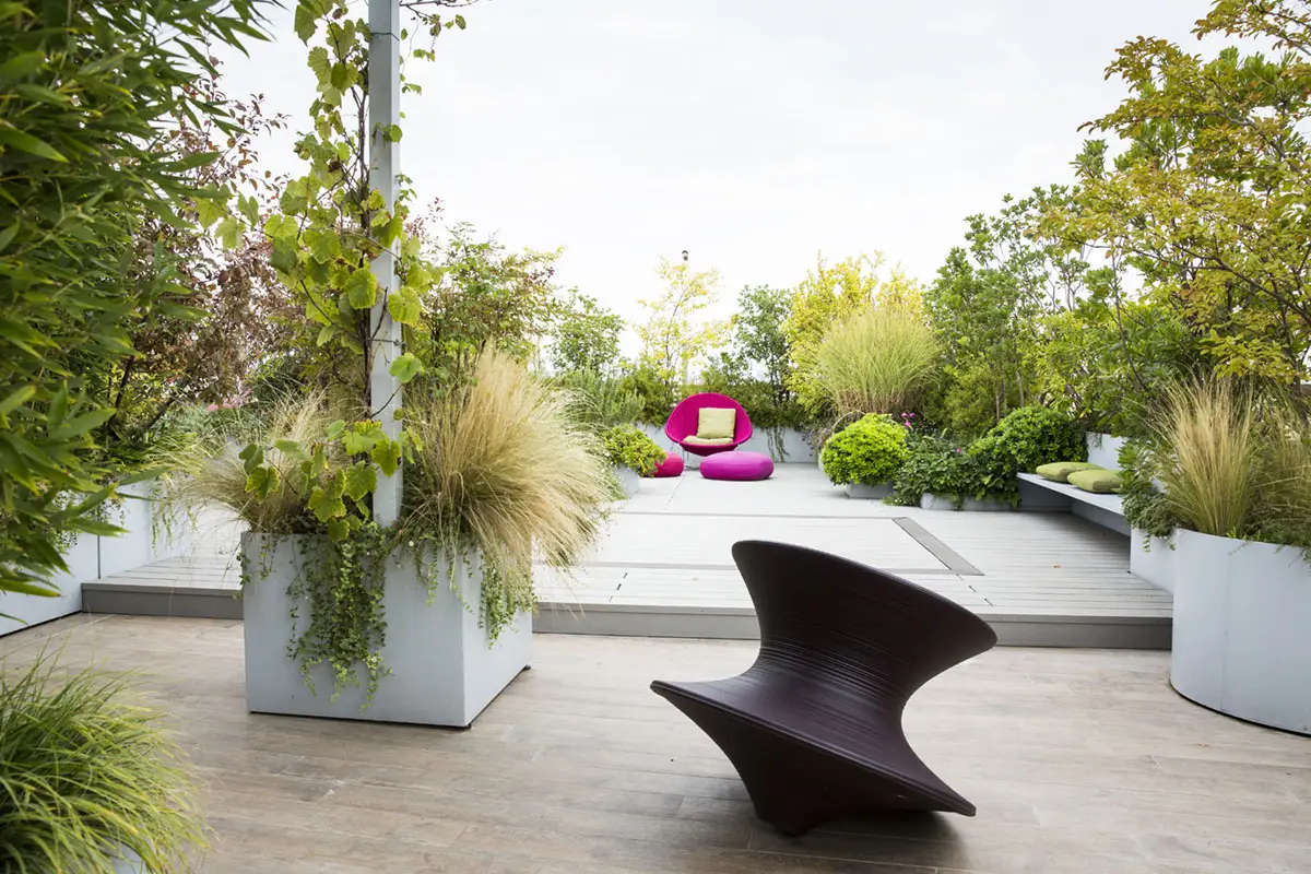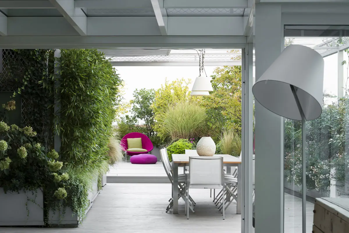 Un grande terrazzo unisce il rigore del disegno e l’esuberanza della vegetazione, accogliendo i desideri apparentemente opposti dei proprietari: atmosfera libera e campestre per lei, ordinata e disciplinata per lui.