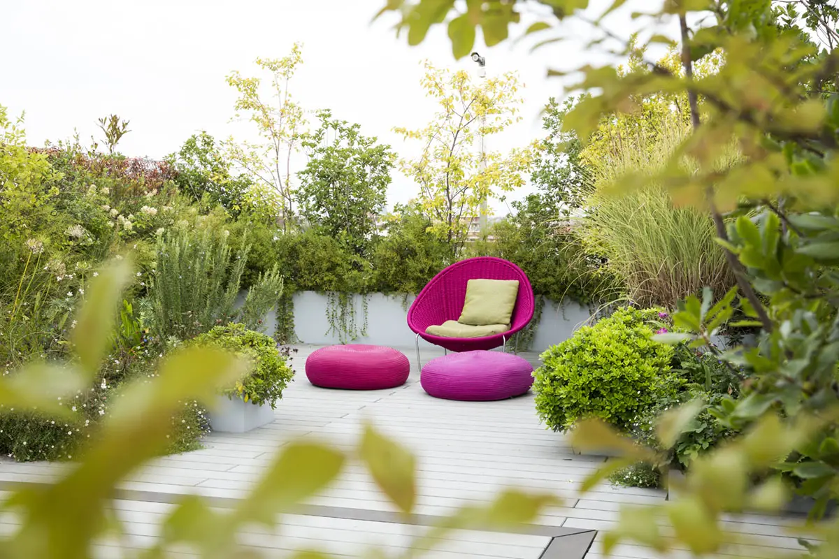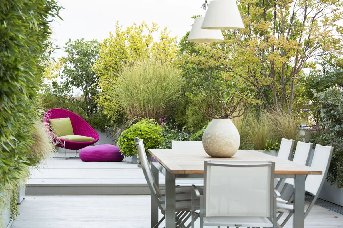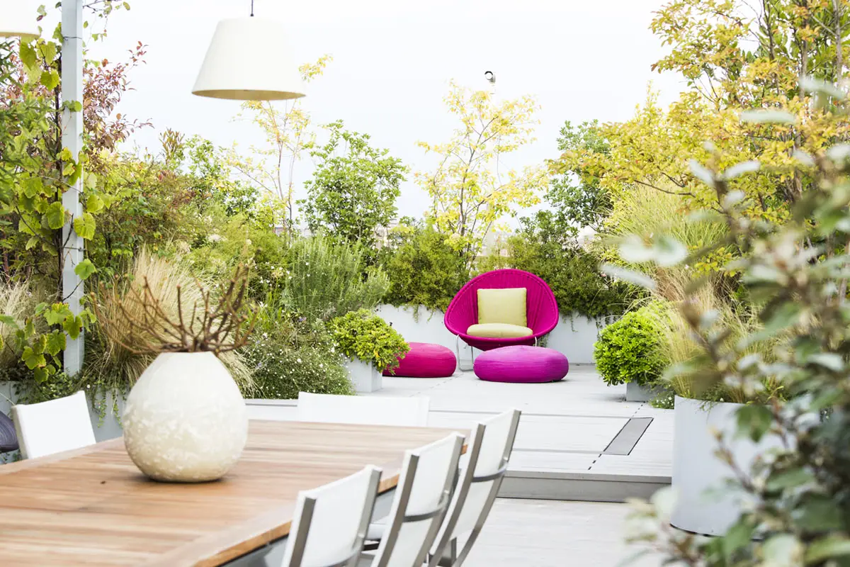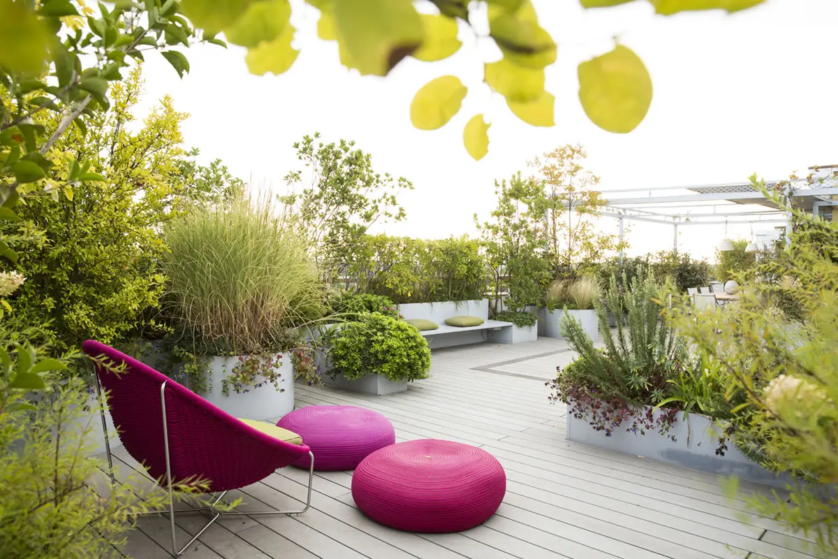 Un grande terrazzo unisce il rigore del disegno e l’esuberanza della vegetazione, accogliendo i desideri apparentemente opposti dei proprietari: atmosfera libera e campestre per lei, ordinata e disciplinata per lui.