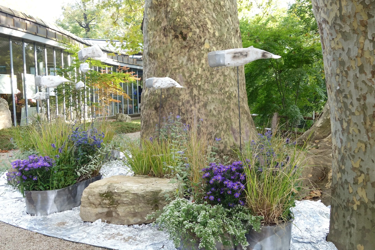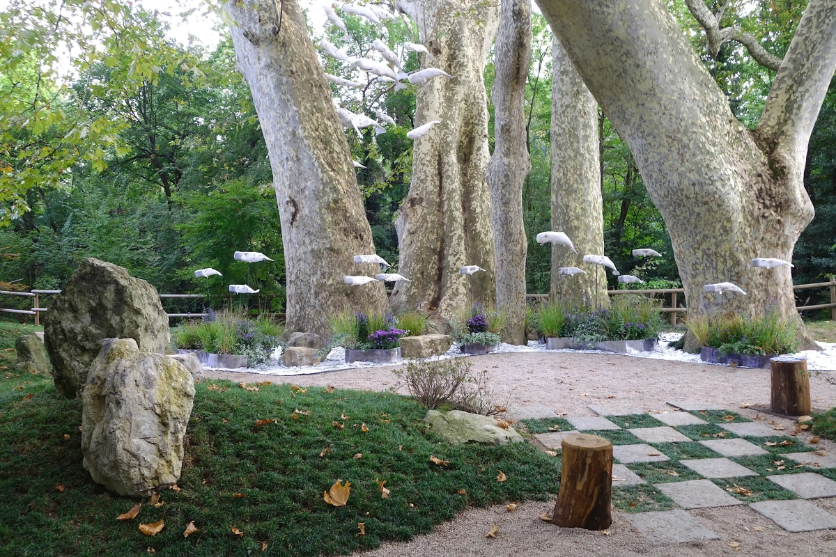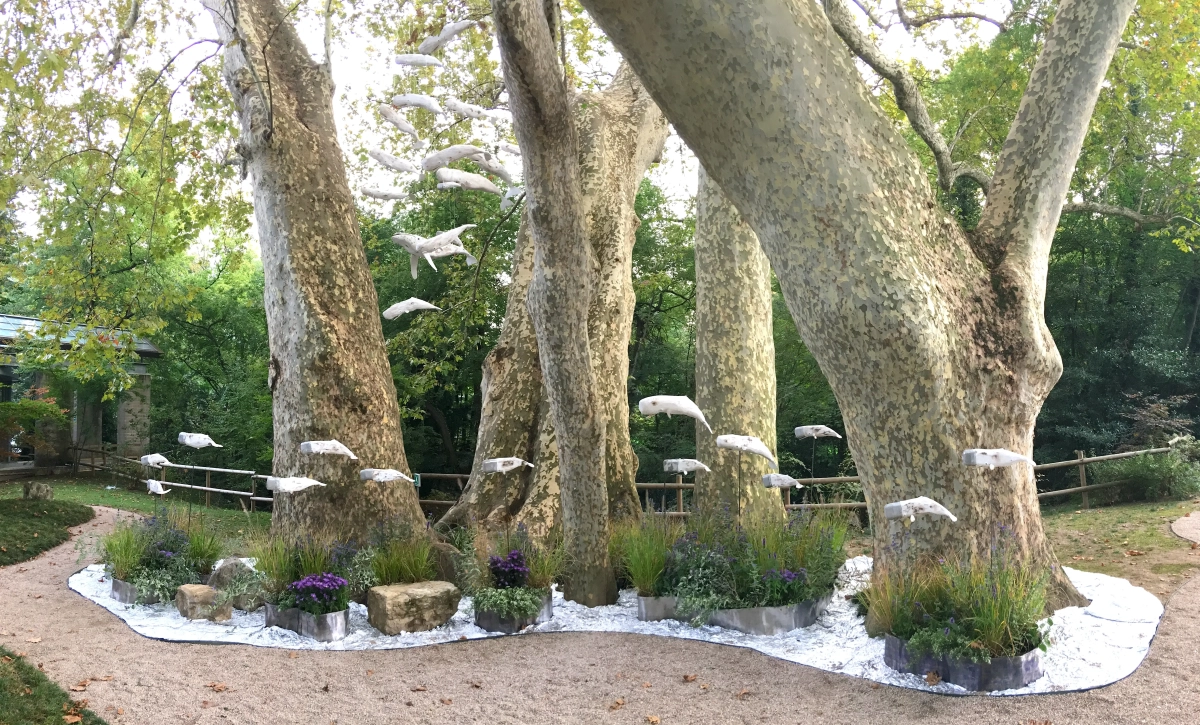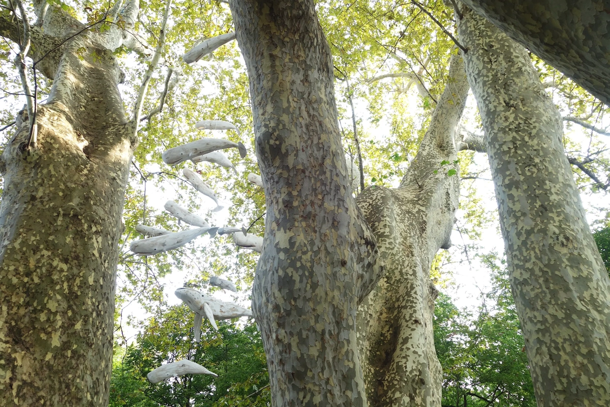Sospesi nel magico colonnato naturale dei platani secolari di Villa Erba, grandi capodogli e megattere, frutto del talento e della fantasia dell’artista Stefano Prina, fluttuano nell’aria tersa e intonano il loro canto ancestrale che si perde nel cielo. Accompagnati dal chiarore lunare, questi leviatani degli oceani si elevano alla ricerca di grandi spazi che il mare, riprodotto attraverso una distesa di fioriture e spighe leggere nei toni degli azzurri e bianchi, divenuto troppo denso e inquinato, non è più in grado di offrire.