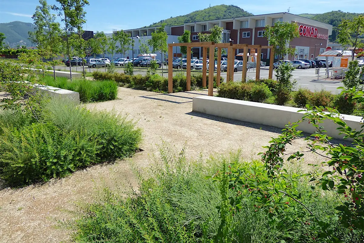 In un’area di proprietà dell’ipermercato CONAD sottoposta a vincolo paesaggistico, accanto ai parcheggi, è nato uno spazio di ricreazione a disposizione principalmente, ma non esclusivamente, dei clienti.