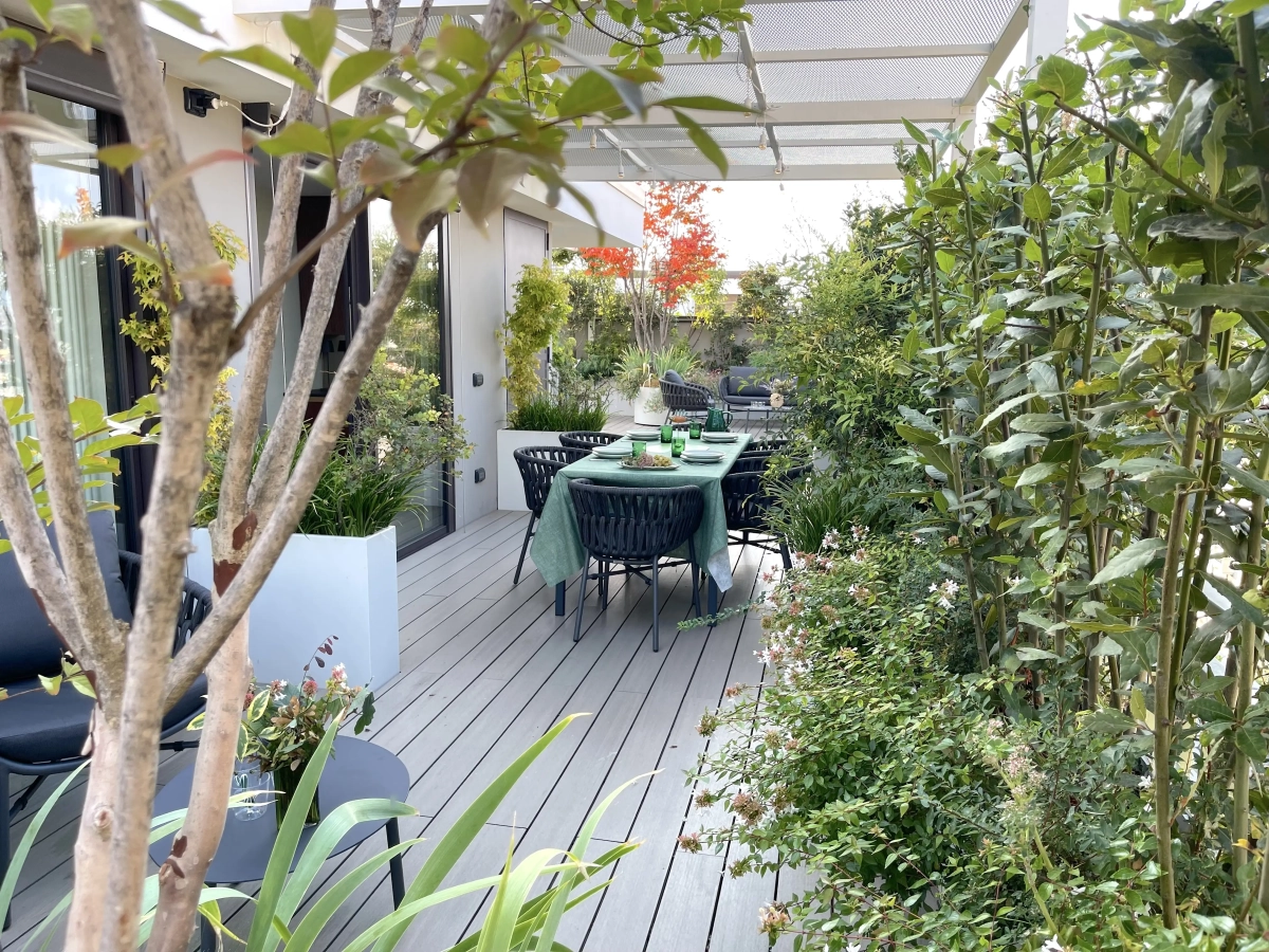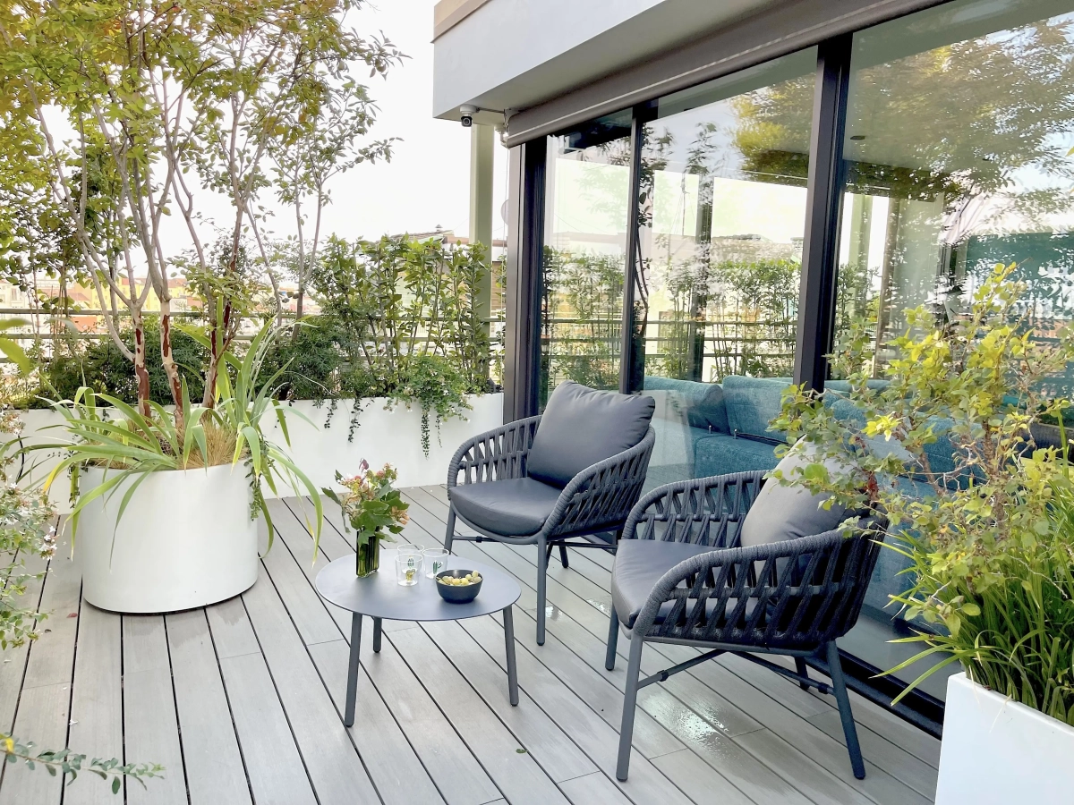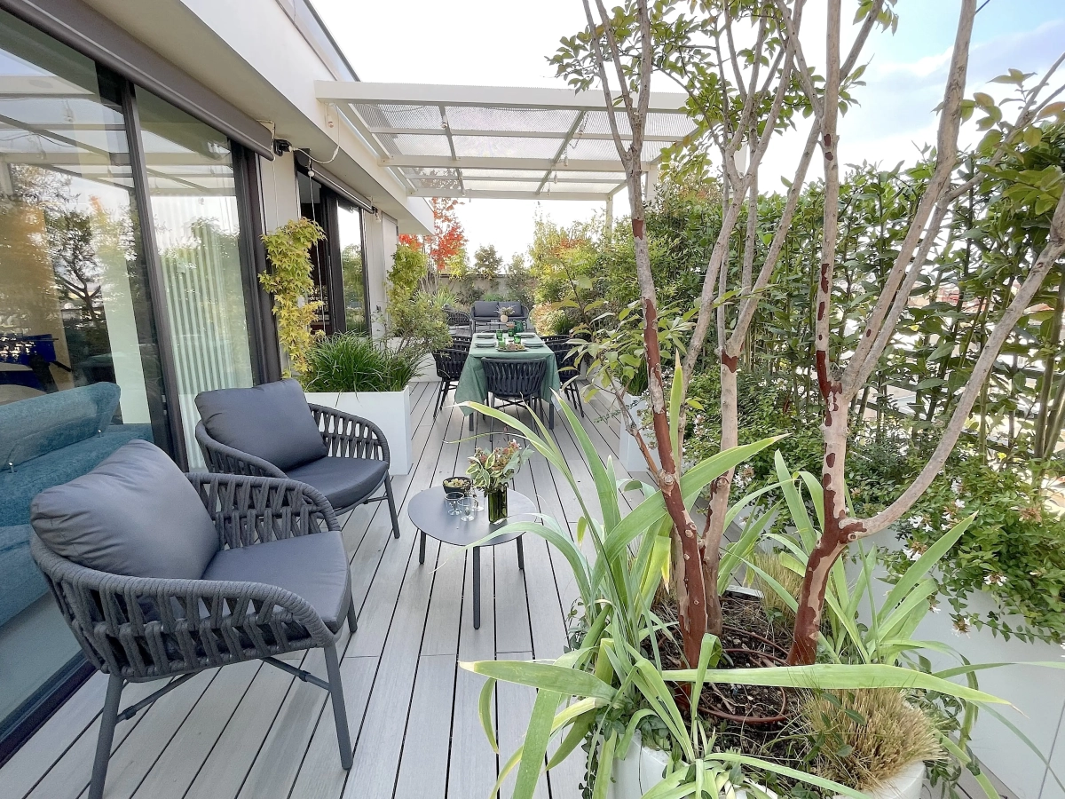 Collocato all’ultimo piano di un edificio contemporaneo, un ampio terrazzo accoglie una vivace famiglia, desiderosa di poter vivere in modo continuativo e gioioso quello spazio aperto, naturale prolungamento della casa.