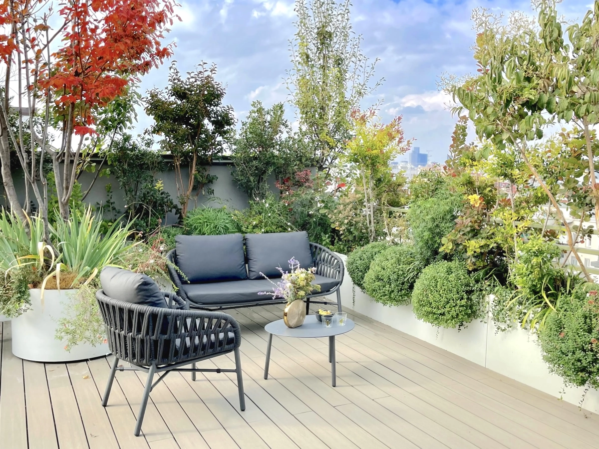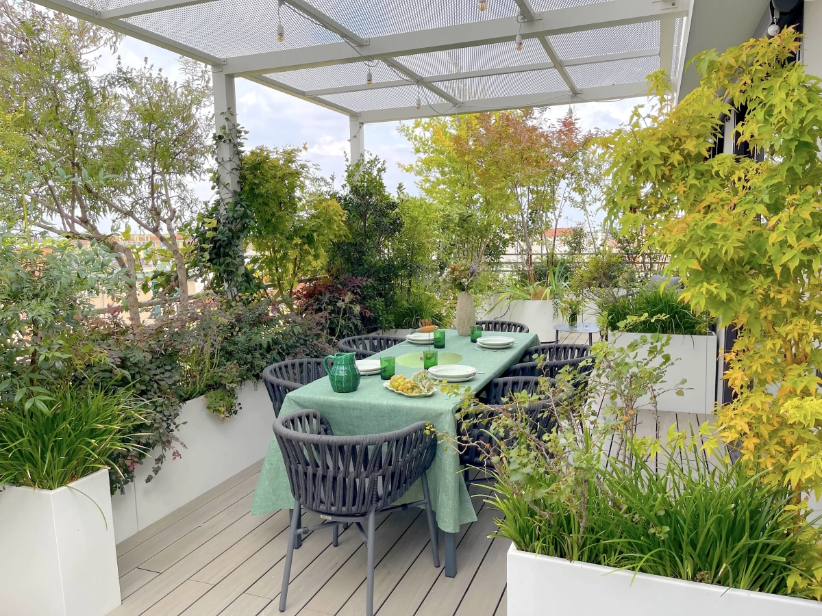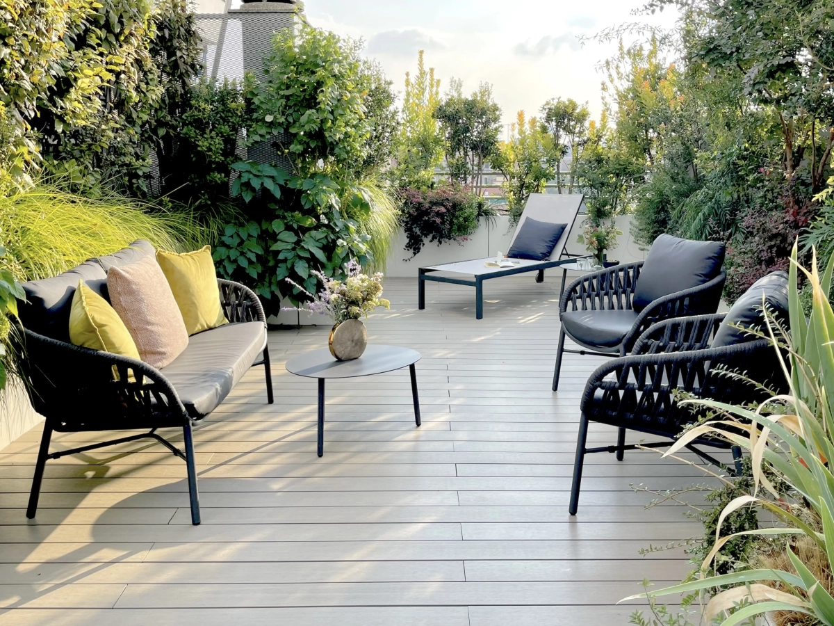 Collocato all’ultimo piano di un edificio contemporaneo, un ampio terrazzo accoglie una vivace famiglia, desiderosa di poter vivere in modo continuativo e gioioso quello spazio aperto, naturale prolungamento della casa.