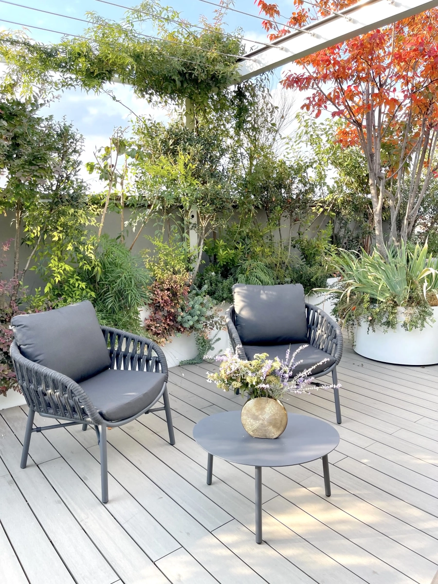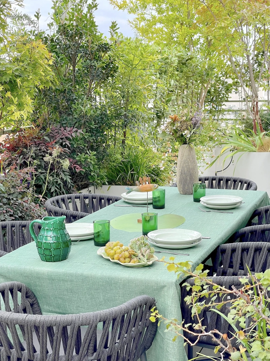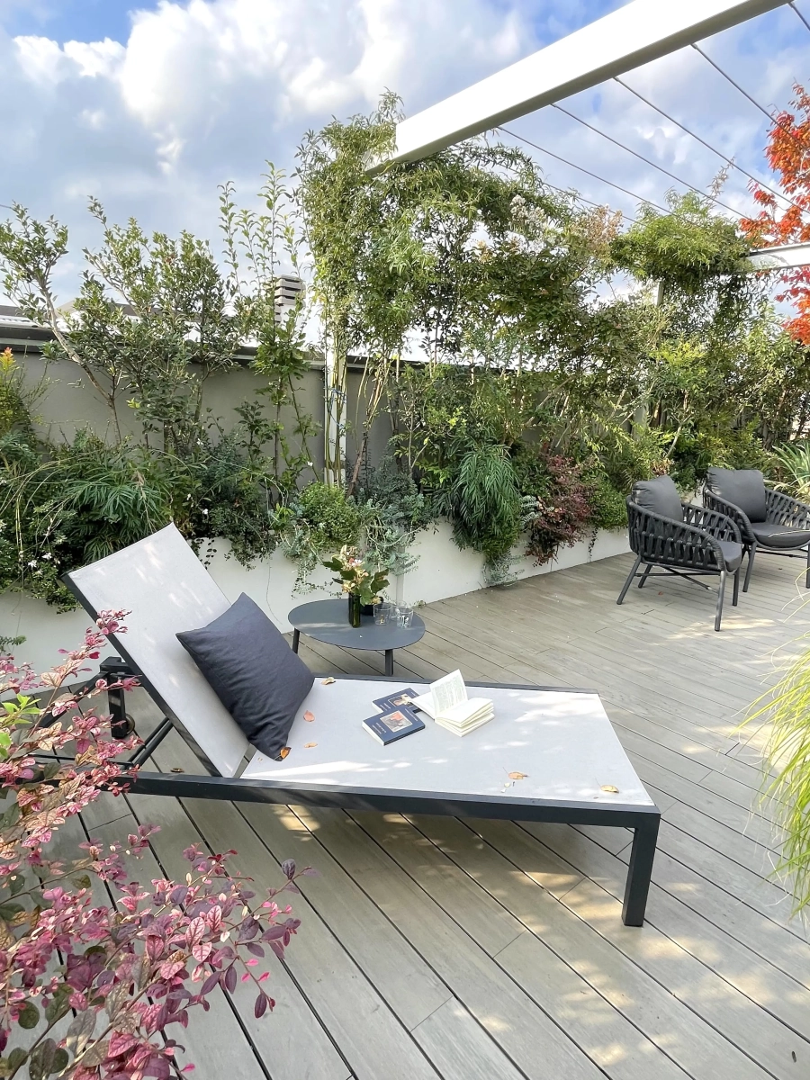 Per far fronte alle varie esigenze, la paesaggista ha creato una successione di ampi spazi multiuso, collocando la vegetazione quasi esclusivamente lungo il perimetro e ricorrendo ad arredi leggeri, facili da spostare a seconda dell’occasione. Per creare zone d’ombra, sono stati inseriti due pergolati: uno ripara il tavolo da pranzo, collocato a fianco della cucina all’aperto, l’altro una zona salotto.
