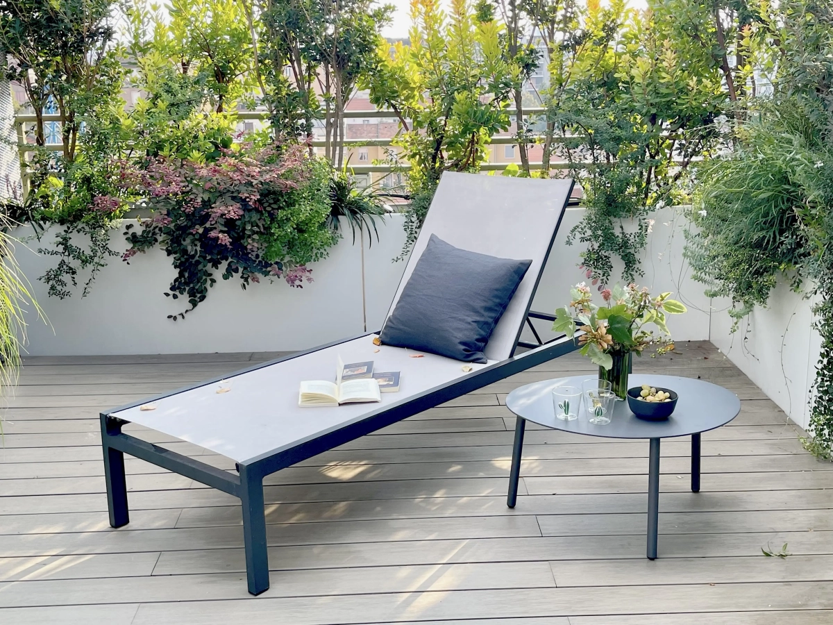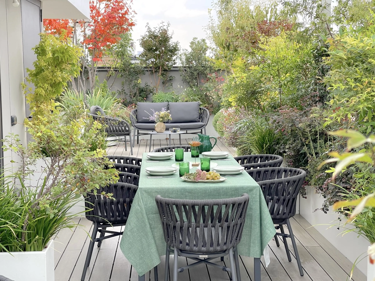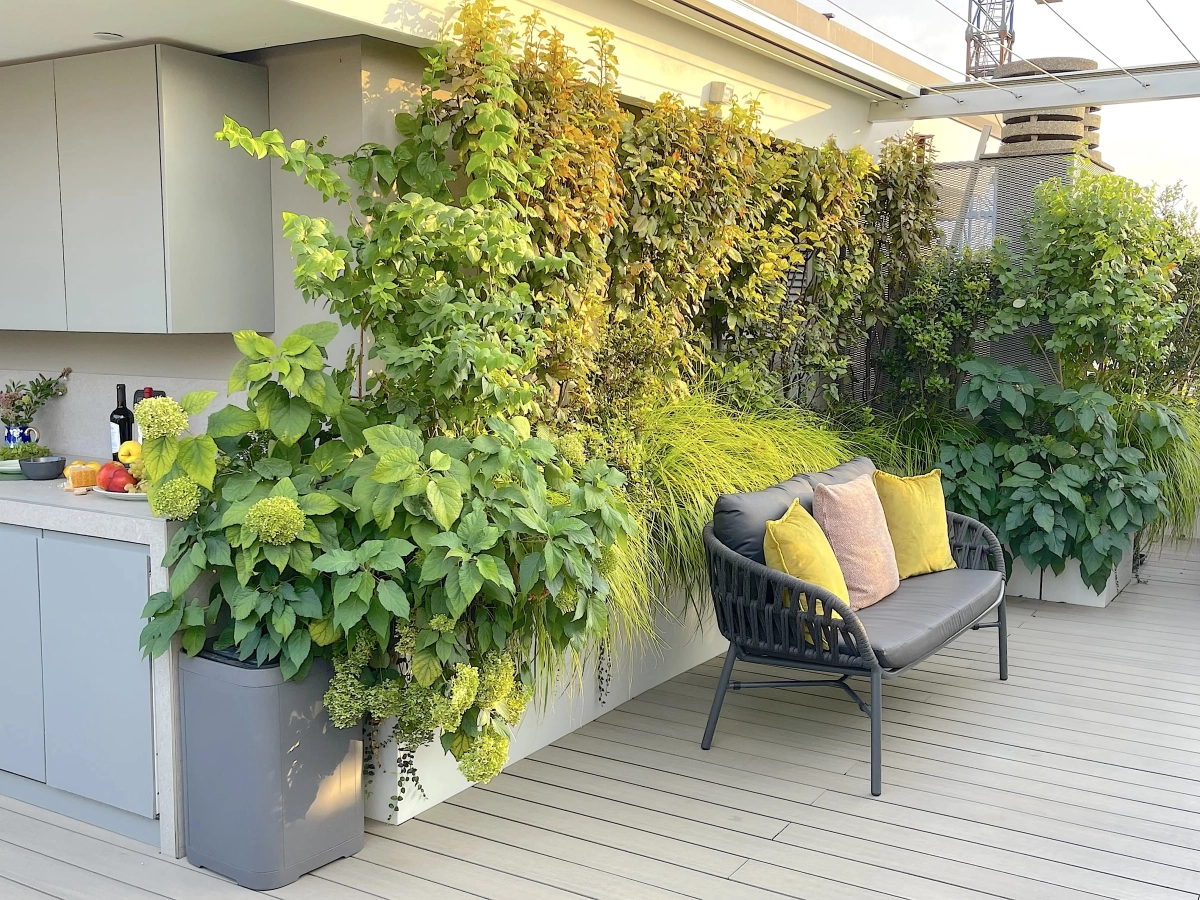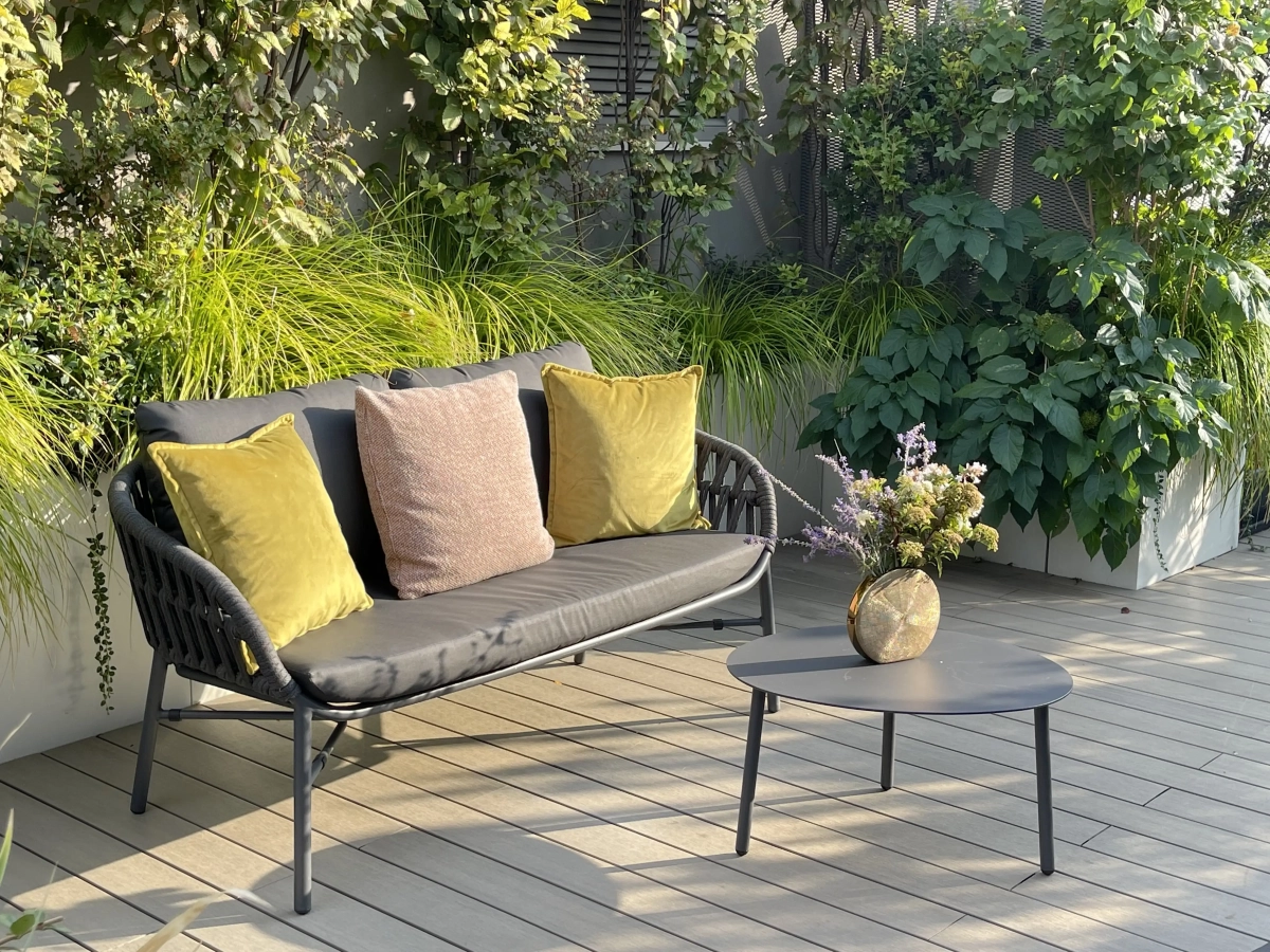 Per far fronte alle varie esigenze, la paesaggista ha creato una successione di ampi spazi multiuso, collocando la vegetazione quasi esclusivamente lungo il perimetro e ricorrendo ad arredi leggeri, facili da spostare a seconda dell’occasione. Per creare zone d’ombra, sono stati inseriti due pergolati: uno ripara il tavolo da pranzo, collocato a fianco della cucina all’aperto, l’altro una zona salotto.