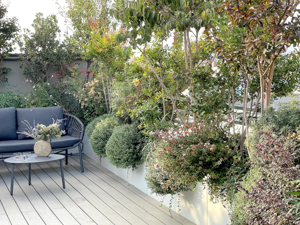 Il terrazzo si sviluppa a ferro di cavallo intorno alla veranda vetrata, posta al piano superiore dell’abitazione; l’intento è stato quello di creare un’area versatile, utilizzabile quanto più a lungo possibile durante l’anno, capace di offrire diversi momenti di svago e interesse per i bambini, oasi rigogliosa e intima.