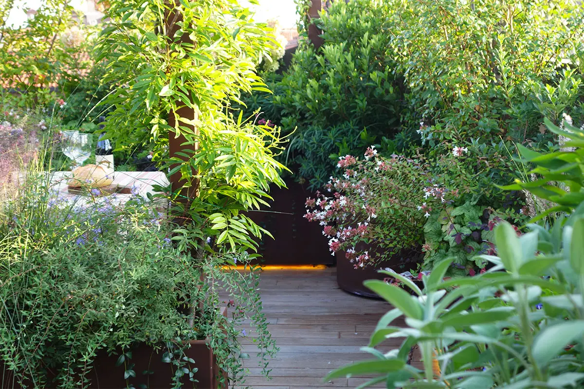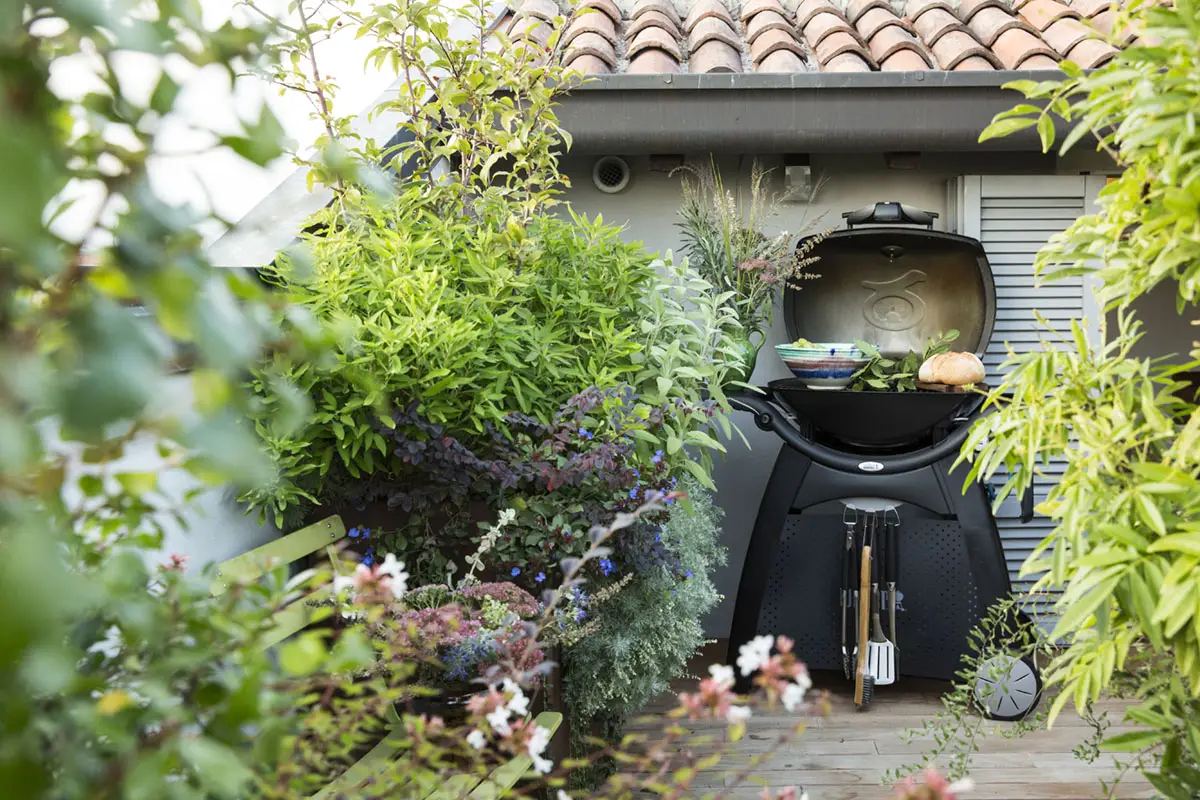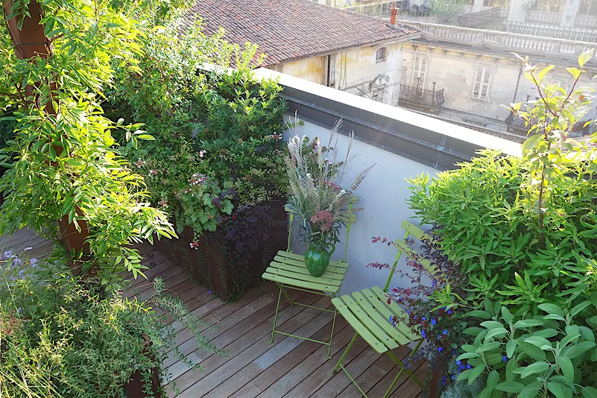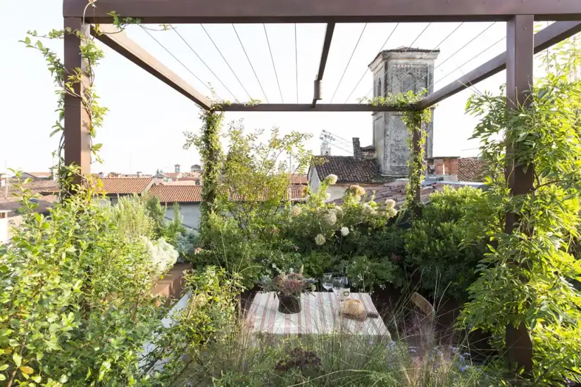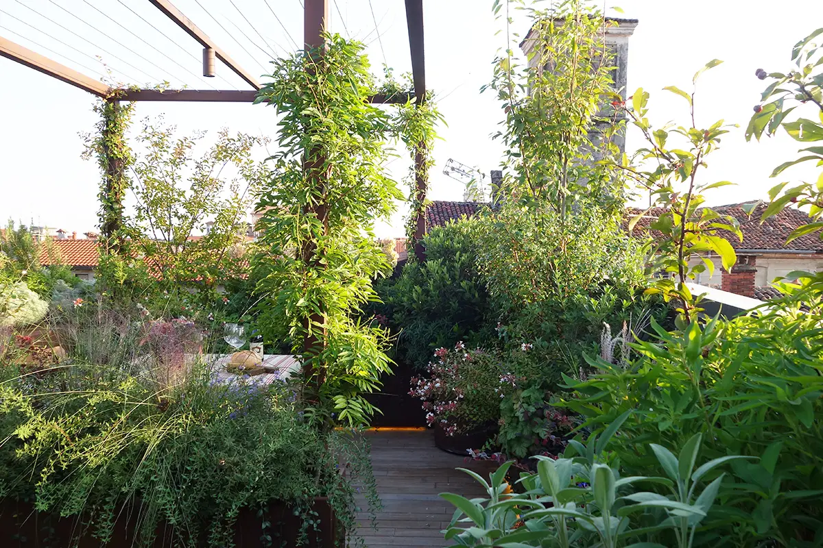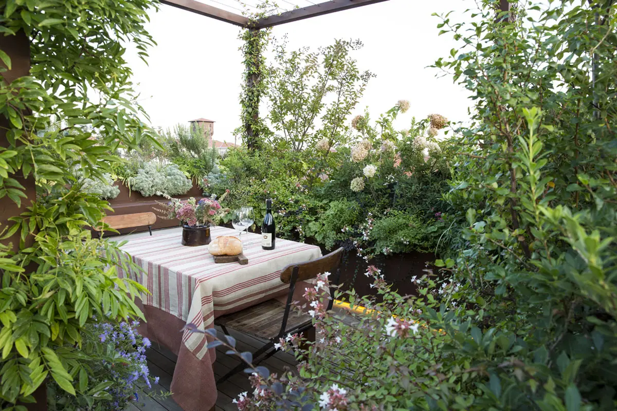 Una piccola stanza traboccante di fronde e di fiori incornicia e cattura il paesaggio circostante, annullando i confini. Una capsula di salvataggio, un microspazio segreto, dedicato alla convivialità ed al relax e curato nei minimi dettagli.