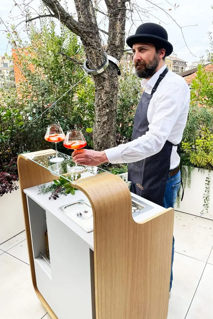 Le fioriere e gli arredi sono stati creati appositamente su disegno dall’azienda La Tavola, all’avanguardia nella realizzazione di prodotti ad alto grado di sofisticatezza nell’universo dei buffet.