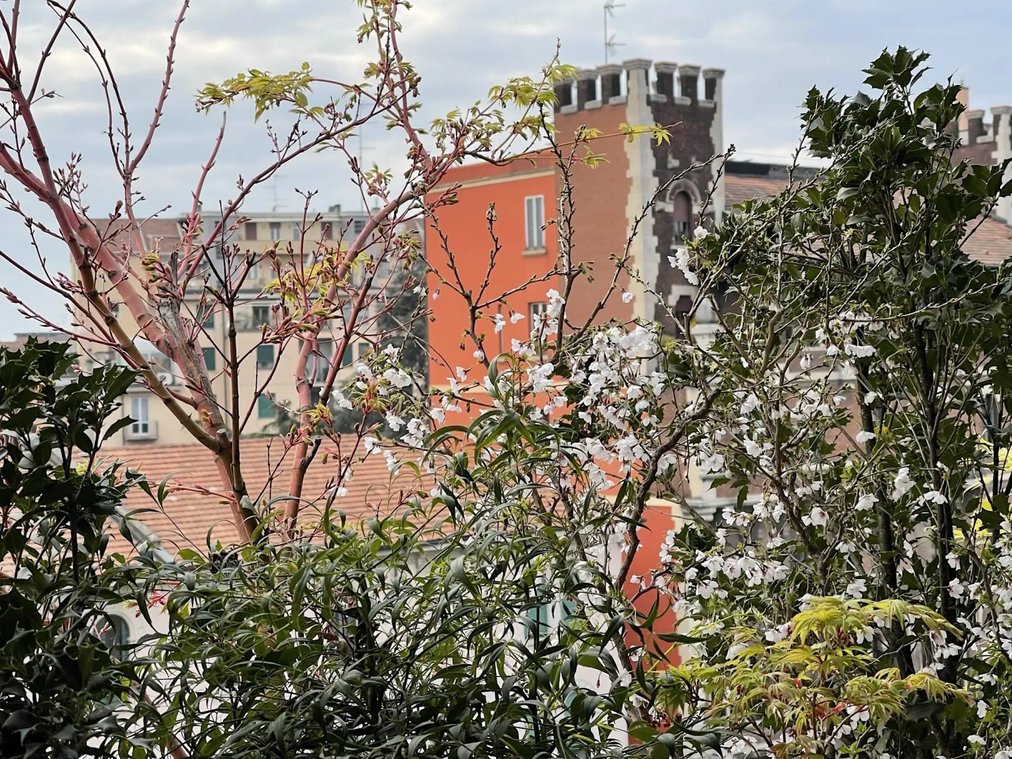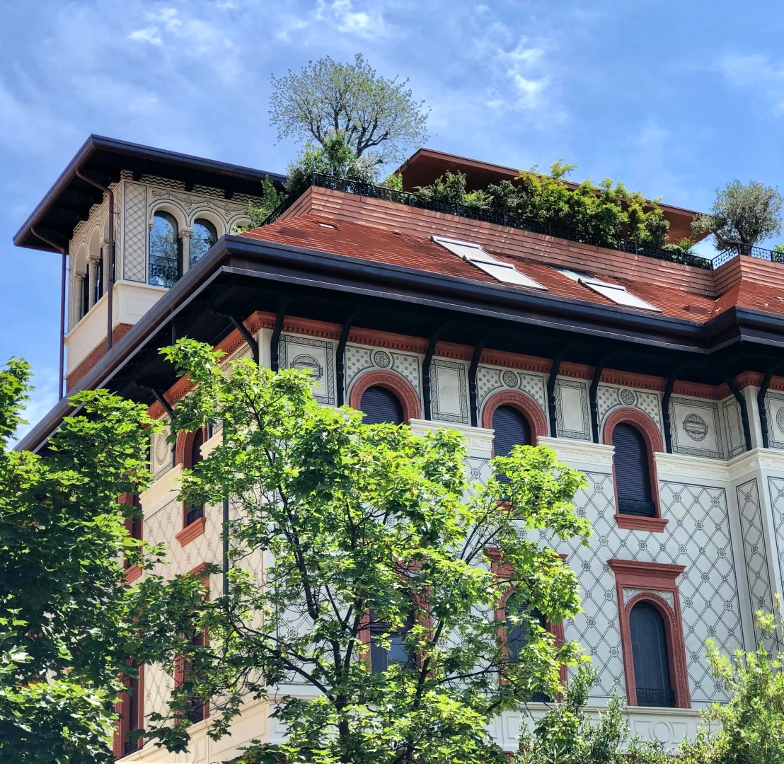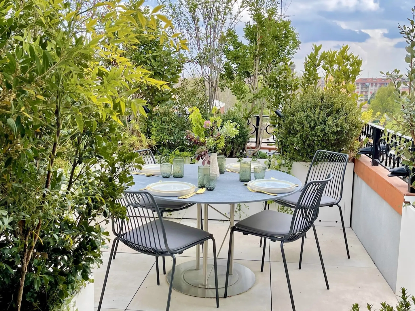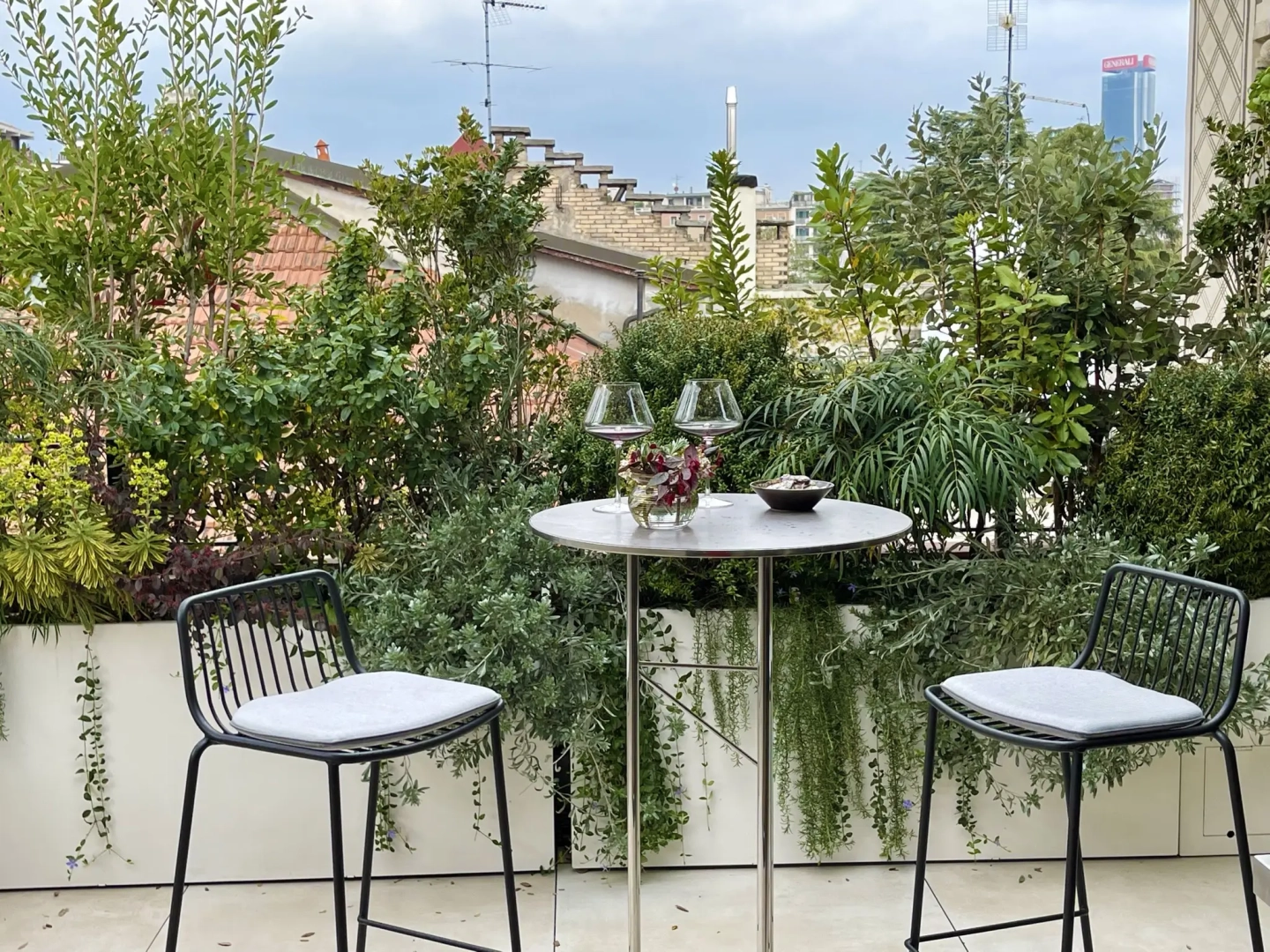 Agli angoli del quadrilatero ampie vasche cilindriche accolgono esemplari di piante mediterranee, passione del proprietario di casa; accanto ad ognuna di esse, piccoli tavoli e sedie svettanti, eleganti e con ridotto ingombro, invitano ad una piacevole sosta, tra il verde esuberante e movimentato. Lo skyline milanese emerge protagonista in vari punti del terrazzo, catturando lo sguardo e regalando una sensazione di spazialità.