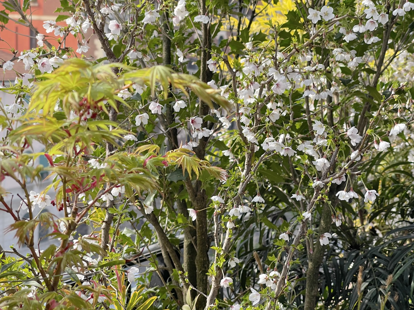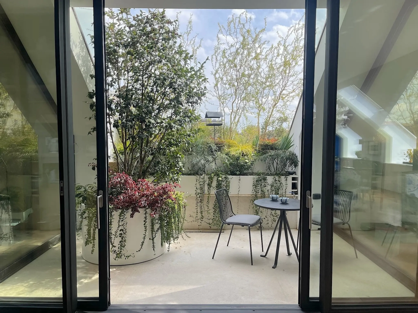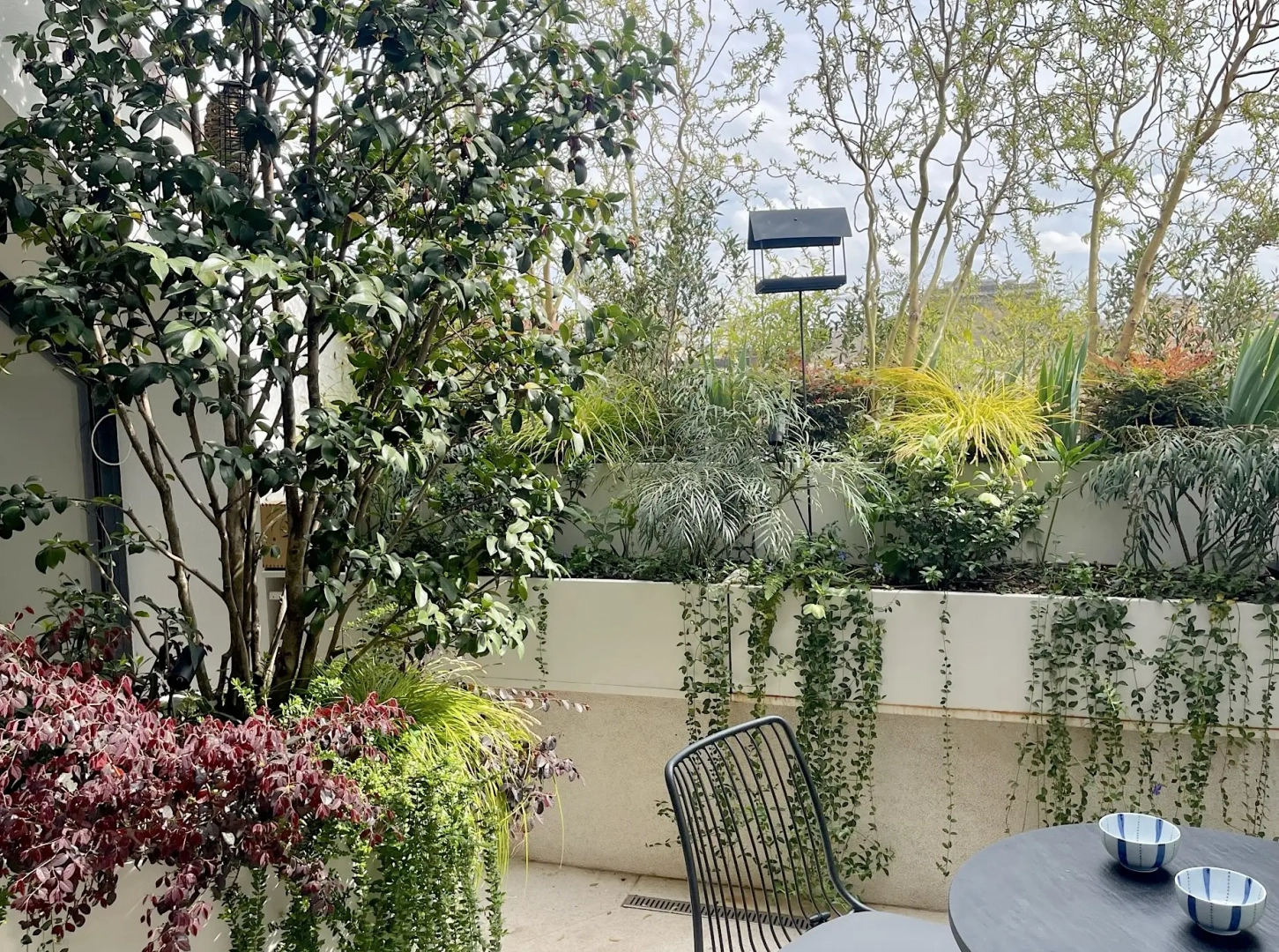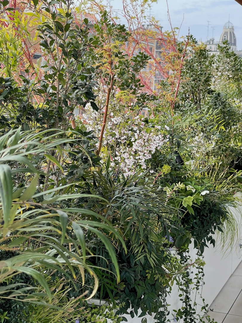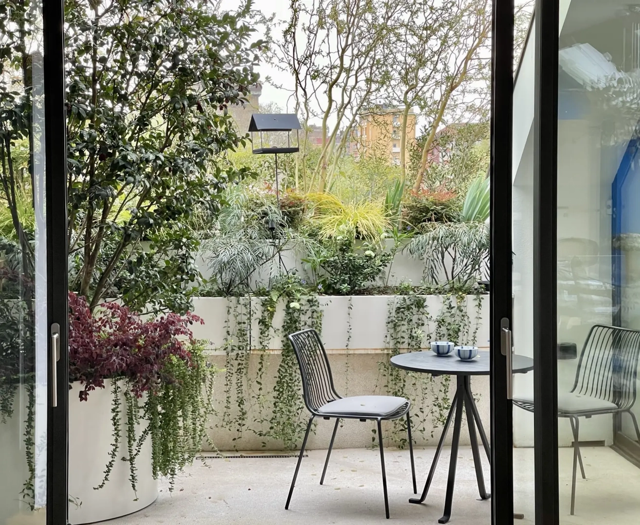 Una lunga successione di fioriere ospita su tutti i quattro lati innumerevoli arbusti, piccoli alberi ed erbacce perenni, con l’obiettivo di creare uno scrigno verde prezioso e riparato, intimo ed accogliente, bello da vedere in tutte le stagioni dell’anno, inverno compreso, attraverso le ampie vetrate che delimitano lo spazio.