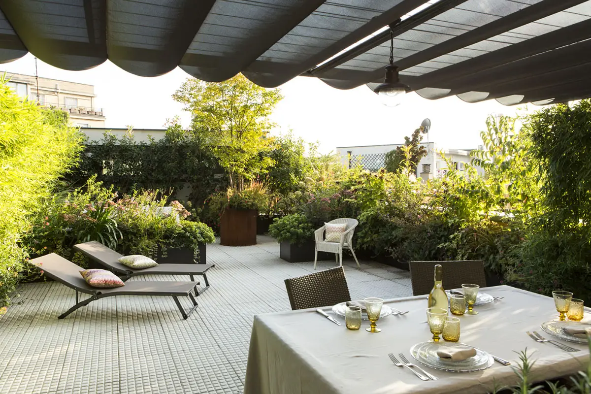 Colori decisi, un tripudio di piante in cui predominano i toni porpora e fucsia, stratagemmi strutturali invisibili ma efficaci, hanno consentito di recuperare quanto già esistente e di contenere i costi di realizzazione per un terrazzo privato di una casa in affitto