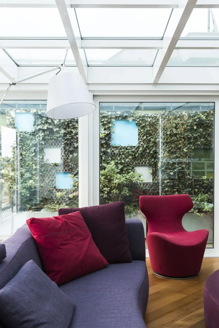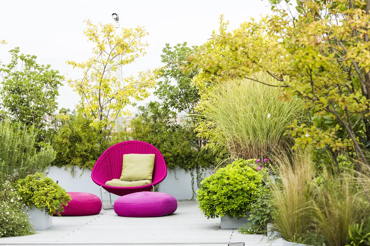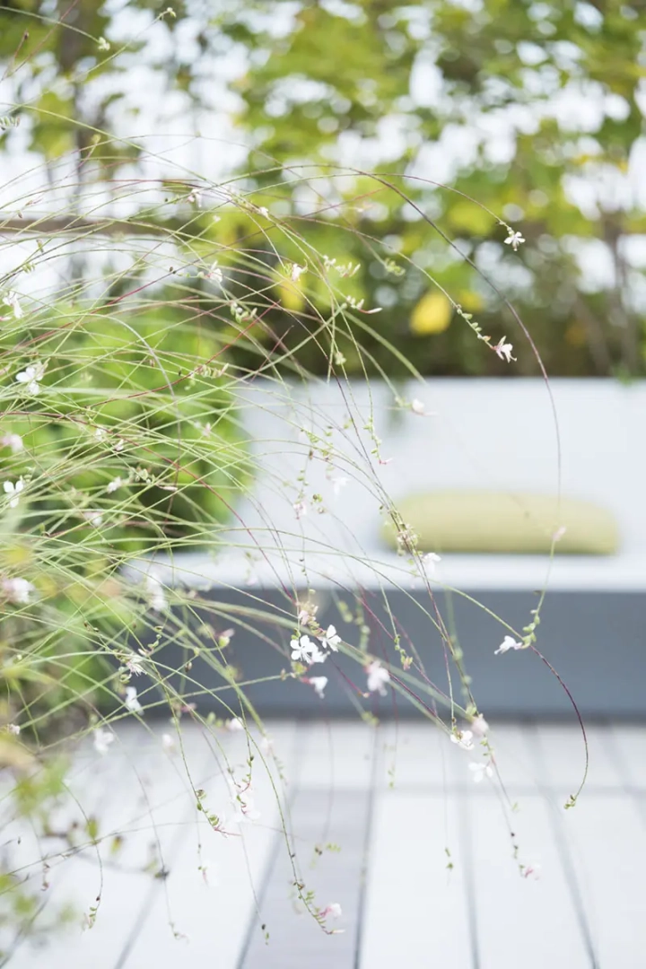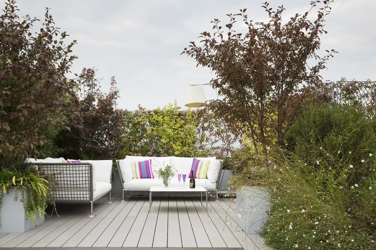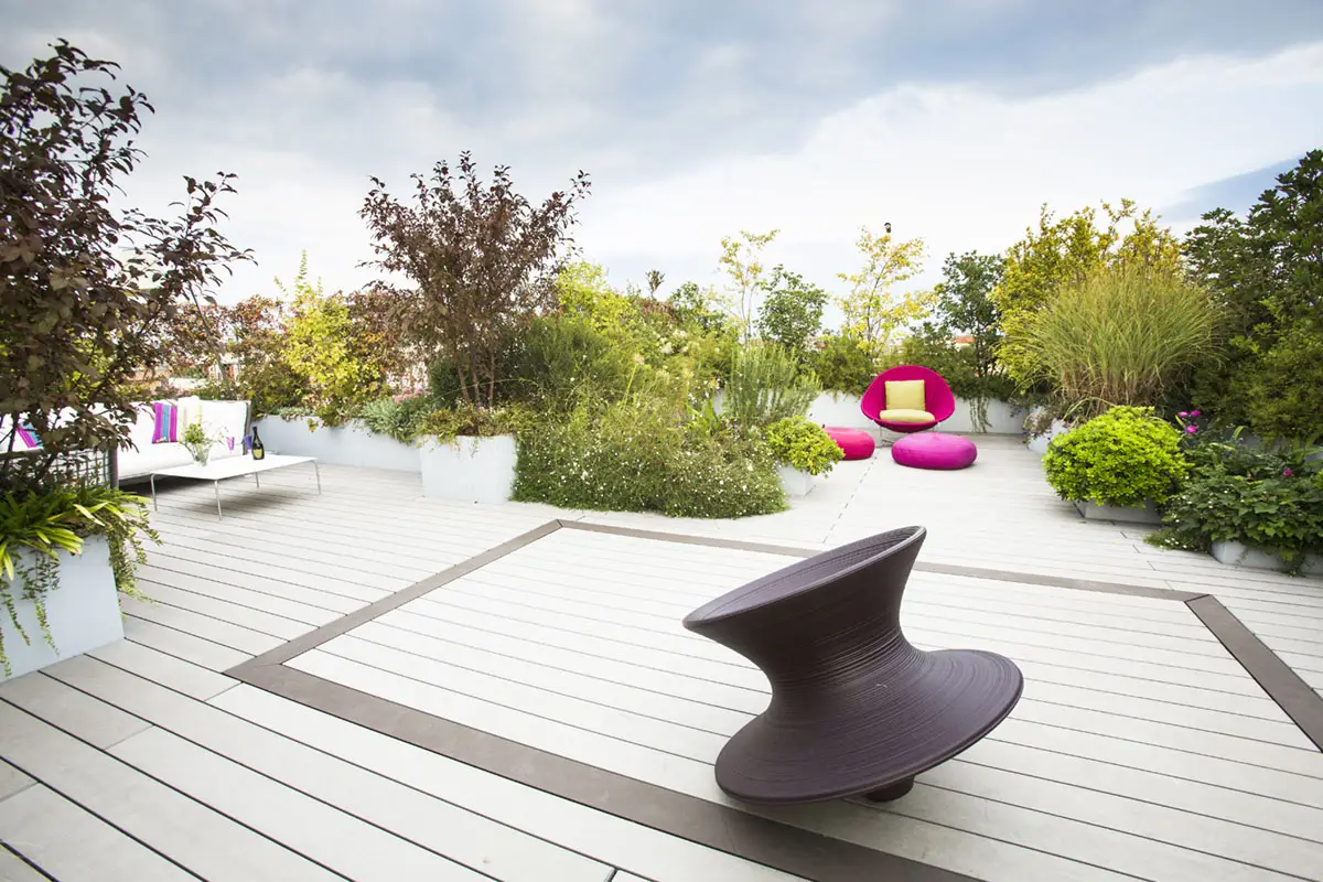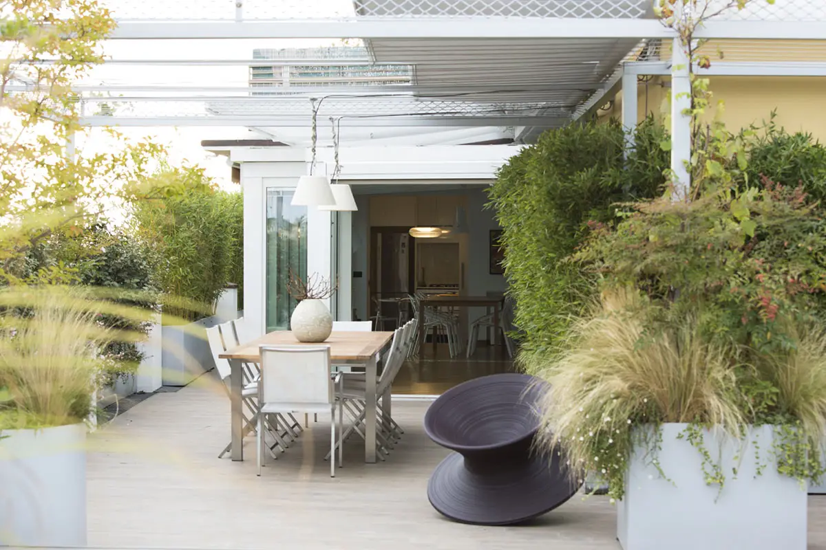 Un grande terrazzo unisce il rigore del disegno e l’esuberanza della vegetazione, accogliendo i desideri apparentemente opposti dei proprietari: atmosfera libera e campestre per lei, ordinata e disciplinata per lui.