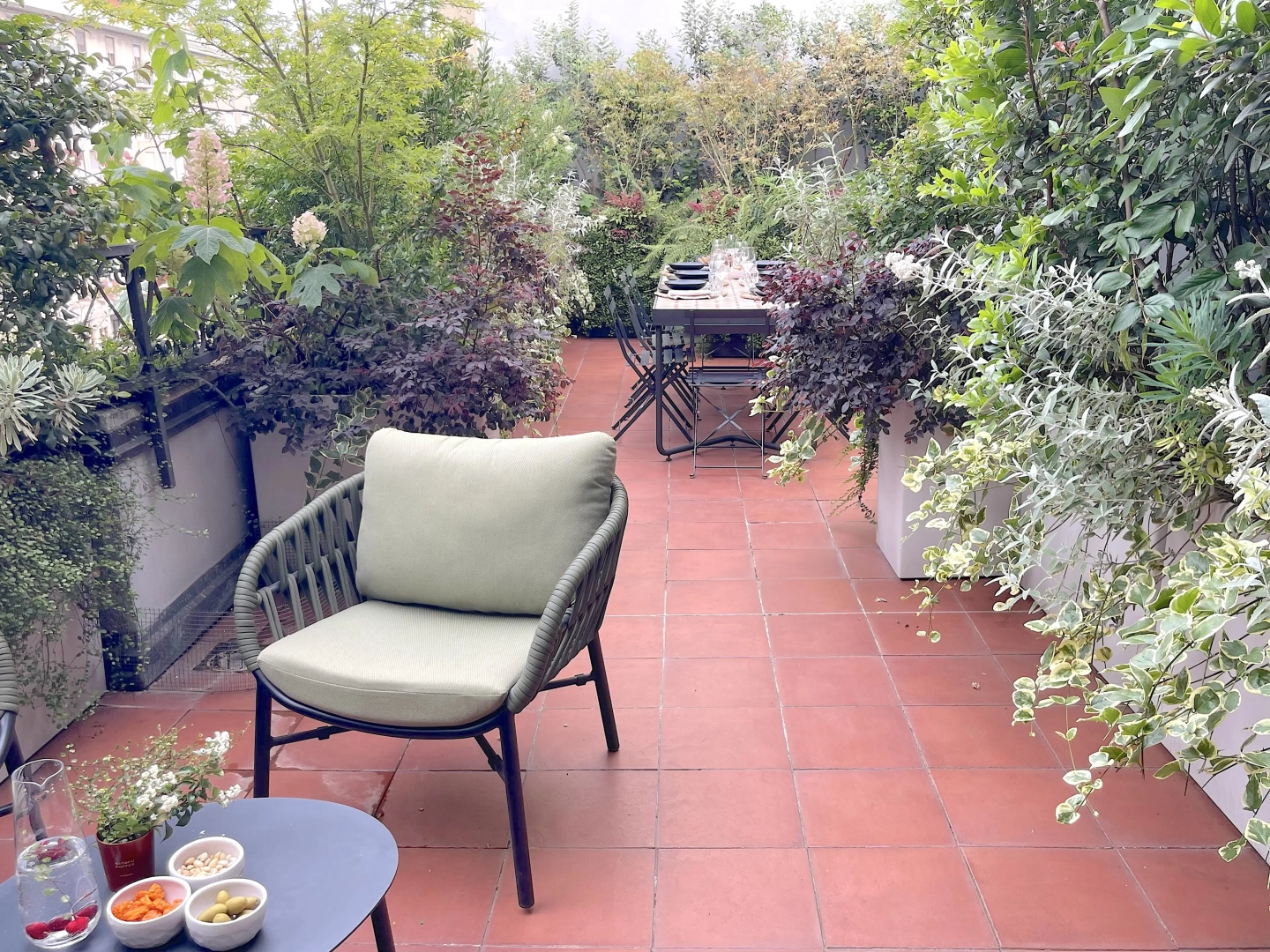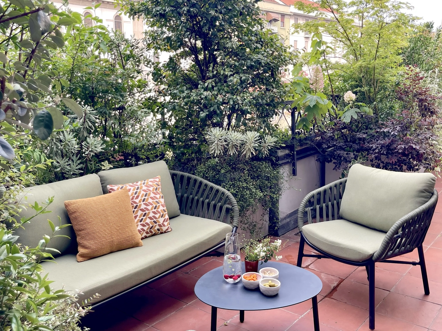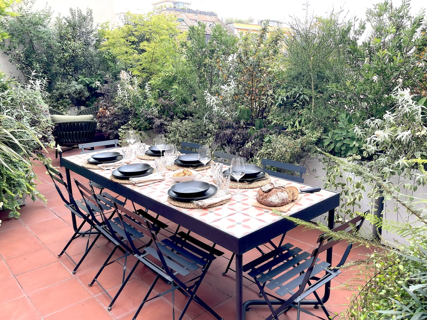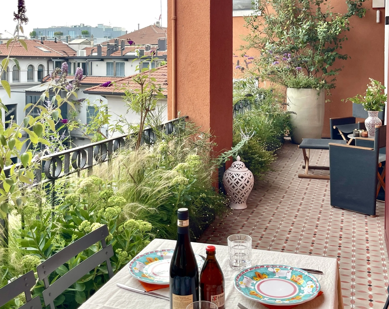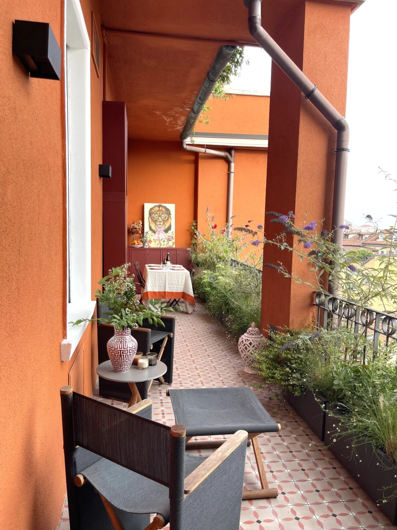Due terrazzi per una casa, diversamente esposti, ma entrambi votati all’accoglienza e alla convivialità. Quello più ampio accoglie, oltre al tavolo da pranzo ed alla zona salotto, una zona cucina dove preparare succulenti BBQ: pur essendo immersi nel verde, ovunque le piante convivono armoniosamente con gli spazi funzionali, vivacizzandoli senza interferenze. Il terrazzo più piccolo, lungo e stretto, crea un’ambiente informale ma sofisticato per un pranzo romantico o uno spuntino veloce, per leggere il giornale godendo della vista del panorama circostante o per una chiacchierata rilassata sorseggiando un drink. Con la calda complicità del color arancio.