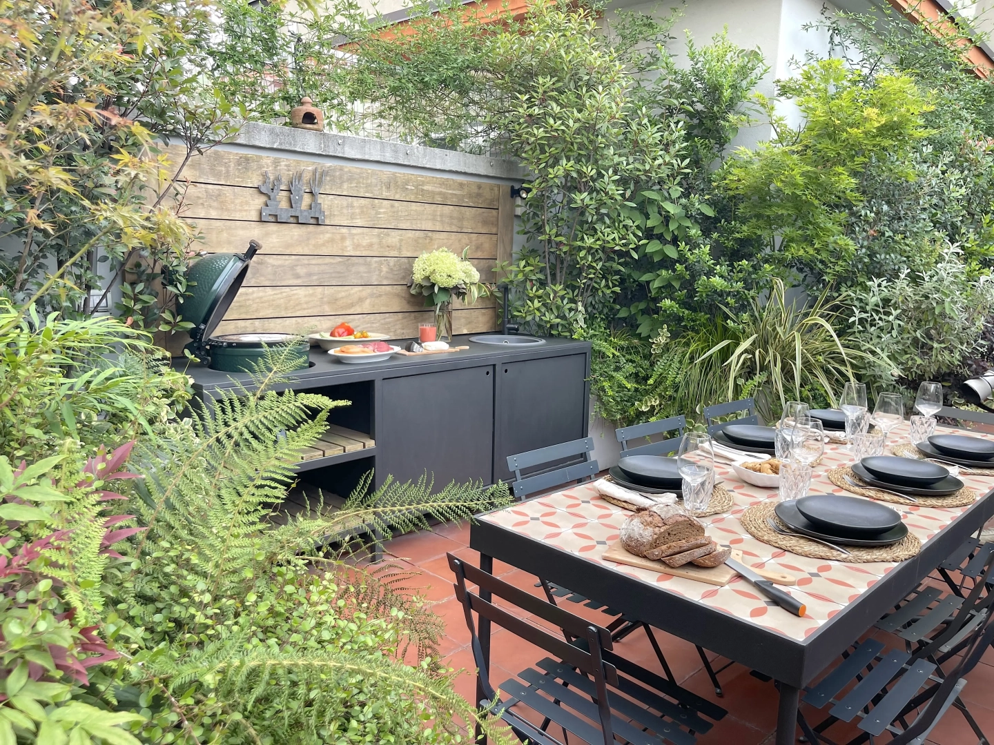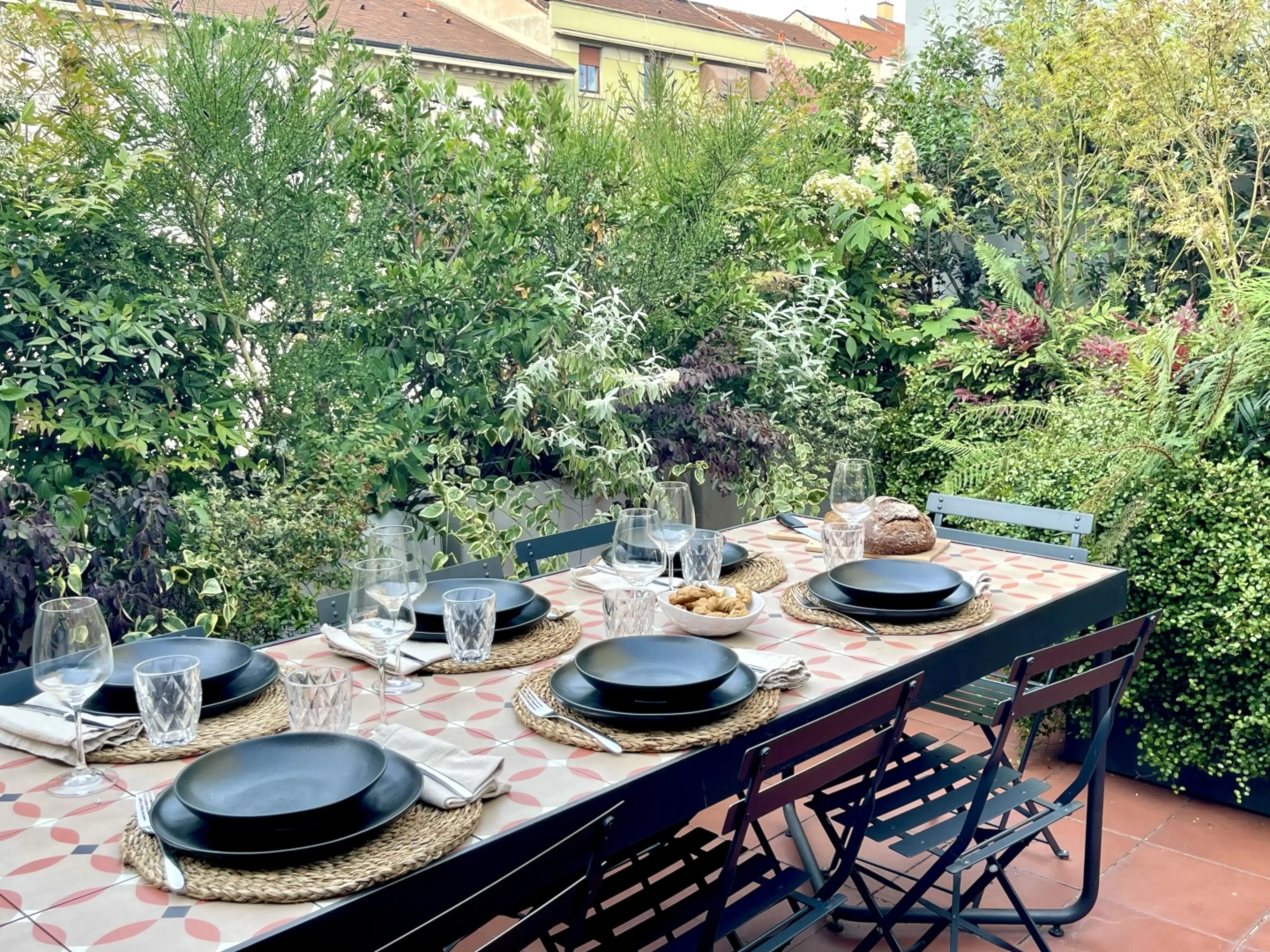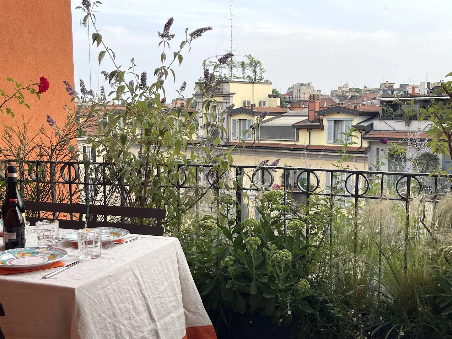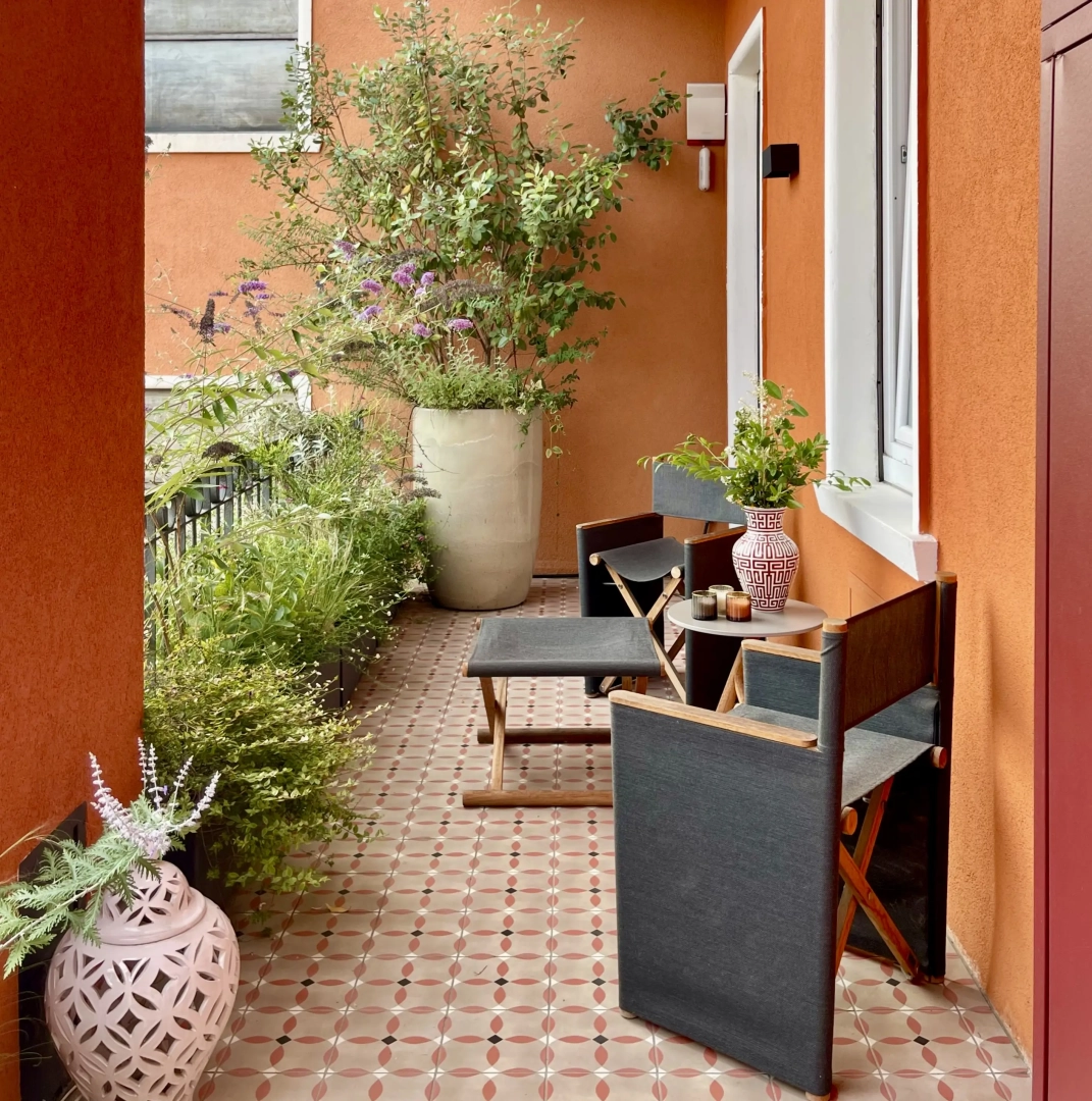 Due terrazzi per una casa, diversamente esposti, ma entrambi votati all’accoglienza e alla convivialità. Quello più ampio accoglie, oltre al tavolo da pranzo ed alla zona salotto, una zona cucina dove preparare succulenti BBQ: pur essendo immersi nel verde, ovunque le piante convivono armoniosamente con gli spazi funzionali, vivacizzandoli senza interferenze. Il terrazzo più piccolo, lungo e stretto, crea un’ambiente informale ma sofisticato per un pranzo romantico o uno spuntino veloce, per leggere il giornale godendo della vista del panorama circostante o per una chiacchierata rilassata sorseggiando un drink. Con la calda complicità del color arancio.