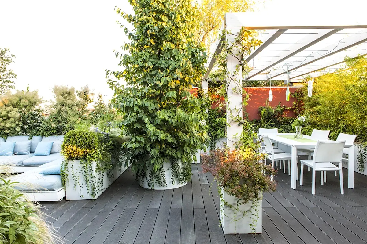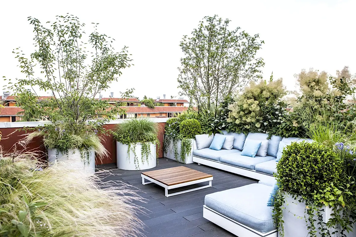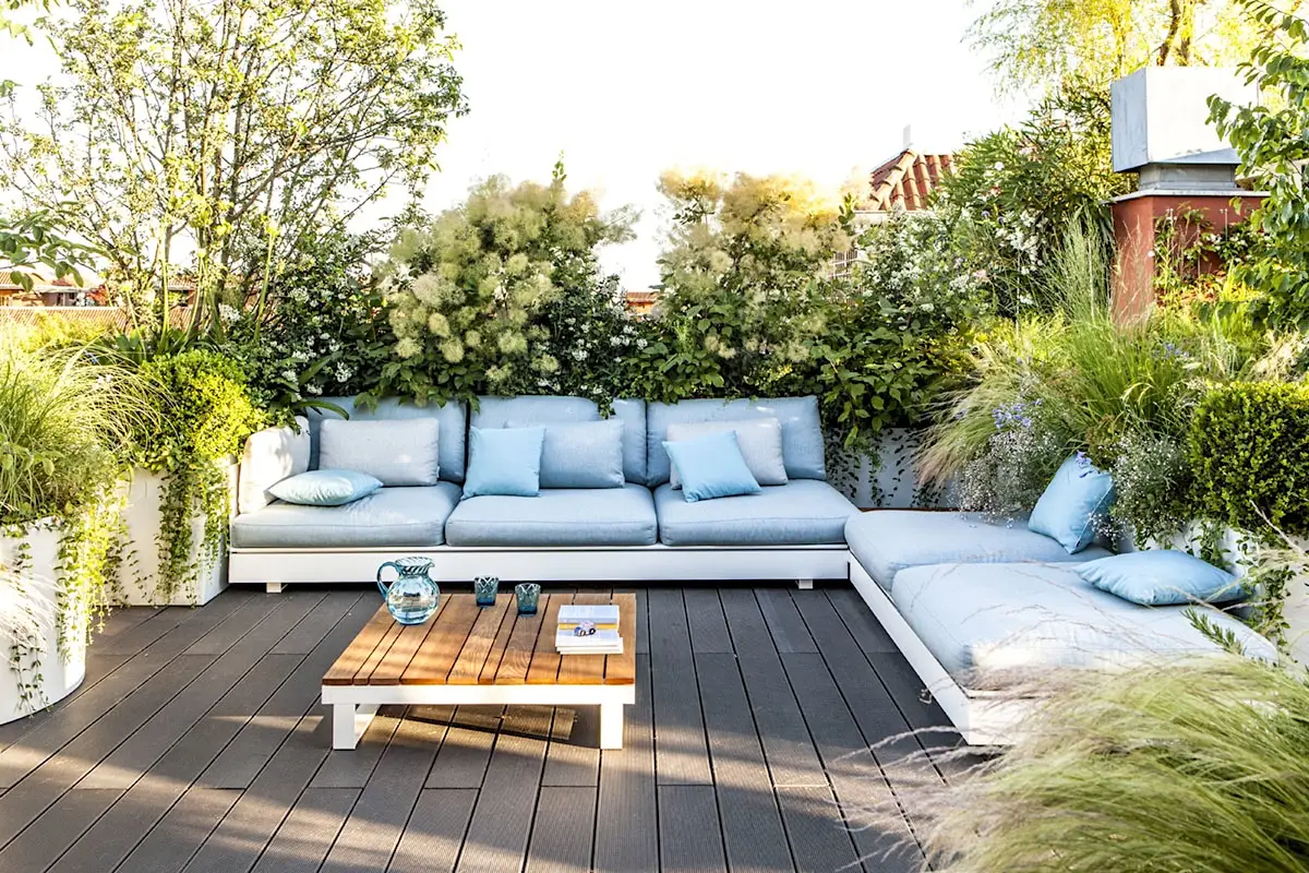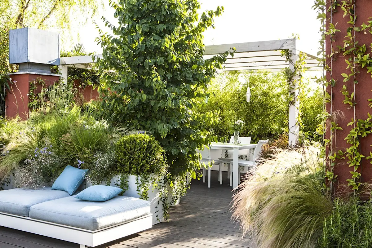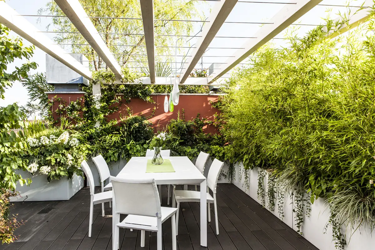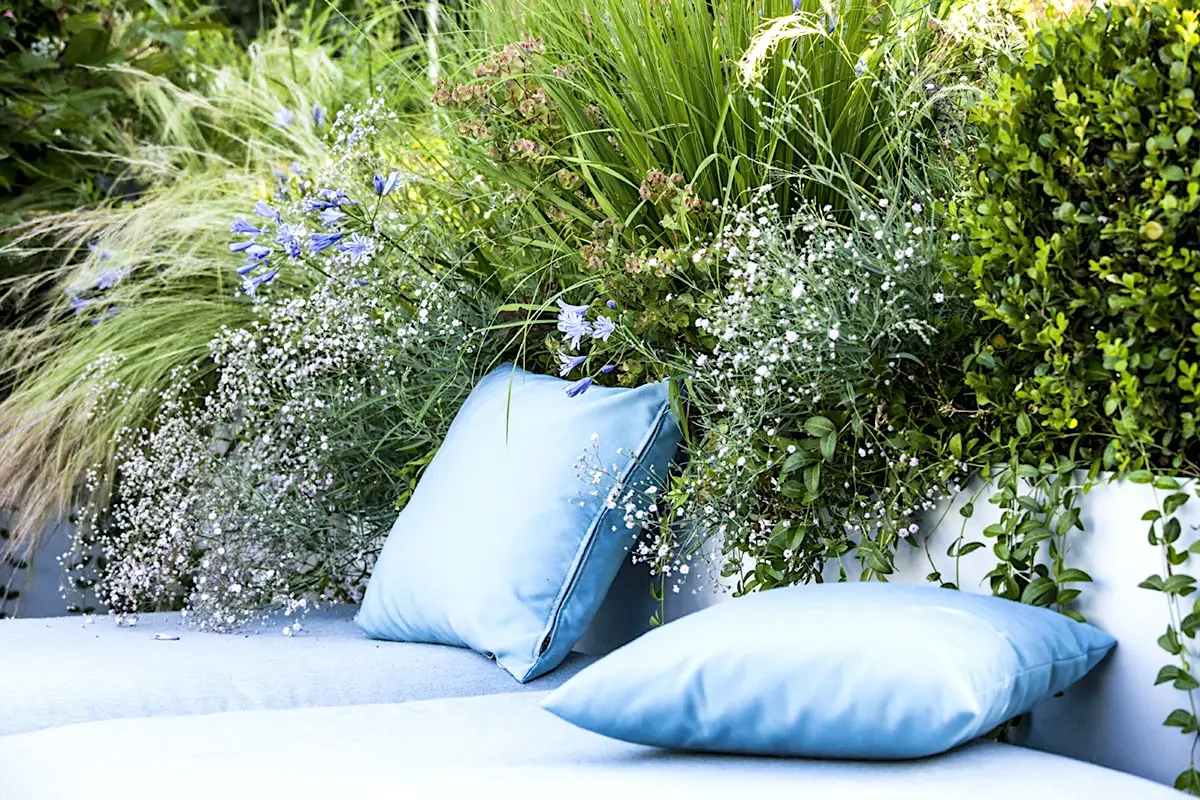 Una grande stanza verde, in continuità visiva con la sala da pranzo e la cucina, unisce l’abitazione al panorama, in un tripudio di fogliami vaporosi e fioriture chiare e leggere, simili a soffici nuvole.