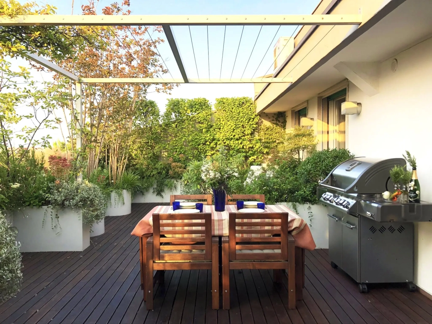 La zona maggiormente fruibile del terrazzo si compone di due aree: una dedicata alla convivialità, come suggerito dal tavolo allungabile e da un ampio BBQ, grande passione del padrone di casa; l’altra dedicata al relax, dominata da sdraio accoglienti.