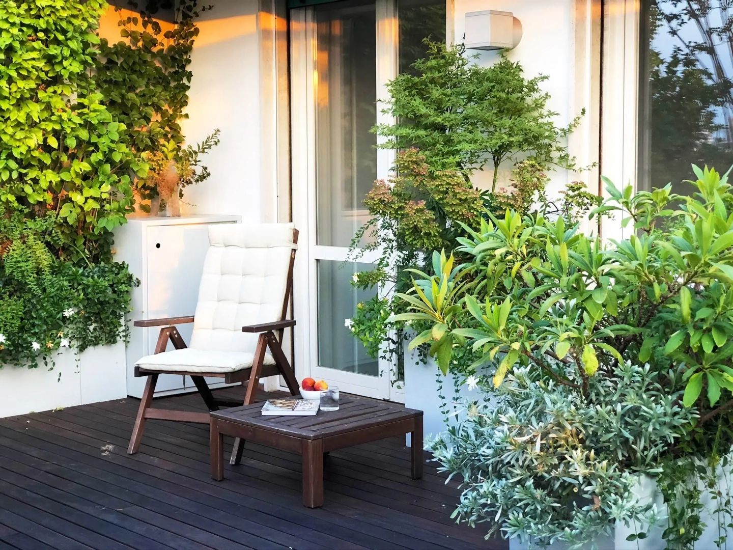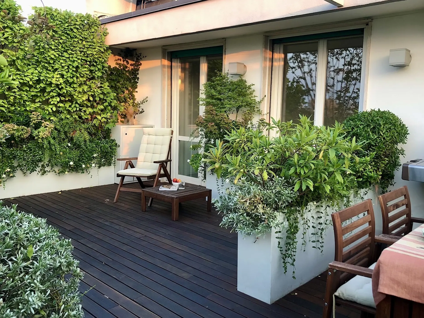 Un terrazzo creato e vissuto come naturale prosecuzione della casa, in comunicazione visiva con gli interni, attraverso le tante finestre che su di esso si affacciano, ma sempre fisicamente raggiungibile semplicemente attraversando uno dei tanti accessi disponibili.