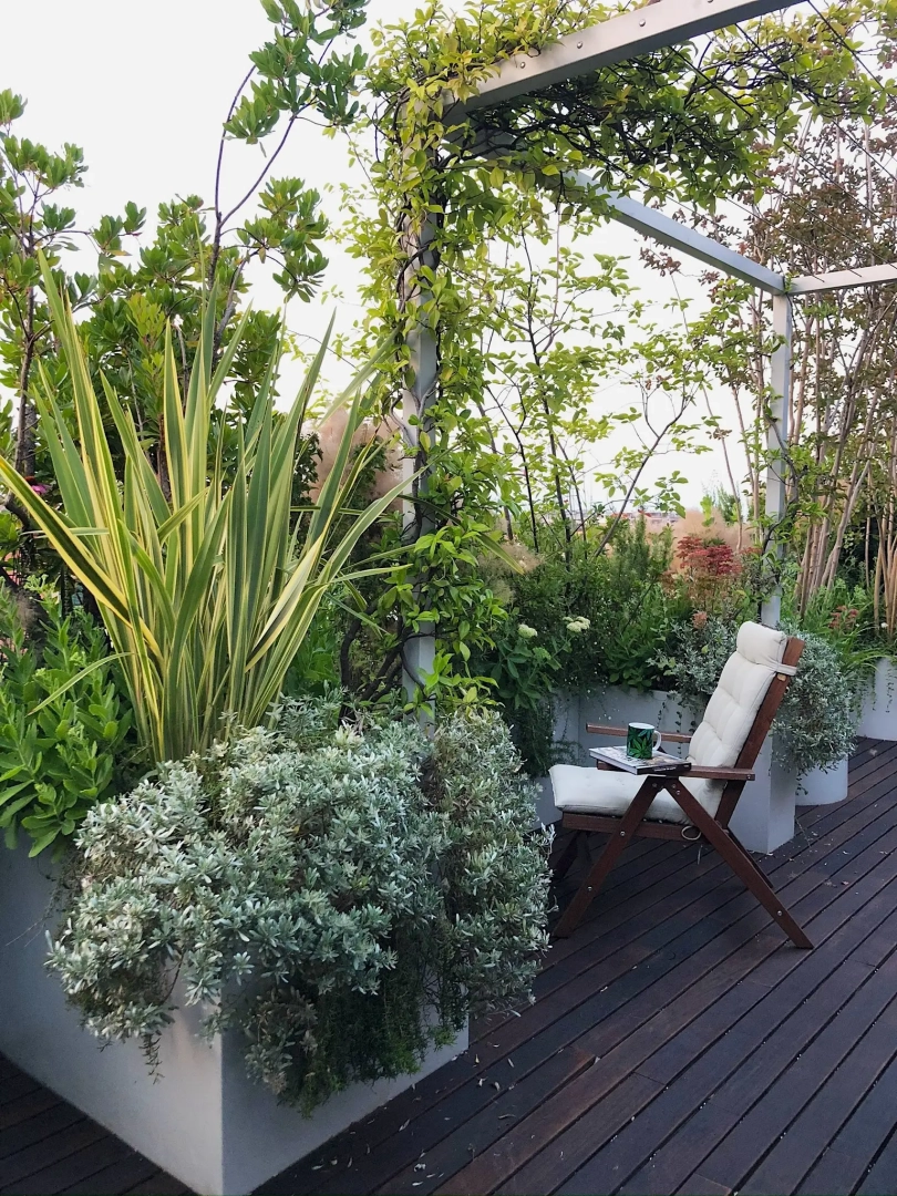 Nella zona pranzo, un pergolato dalle forme geometriche ed essenziali, ne definisce i contorni senza appesantirla, mentre nella zona soggiorno la siepe di carpini, collocata al confine della proprietà, dona privacy.